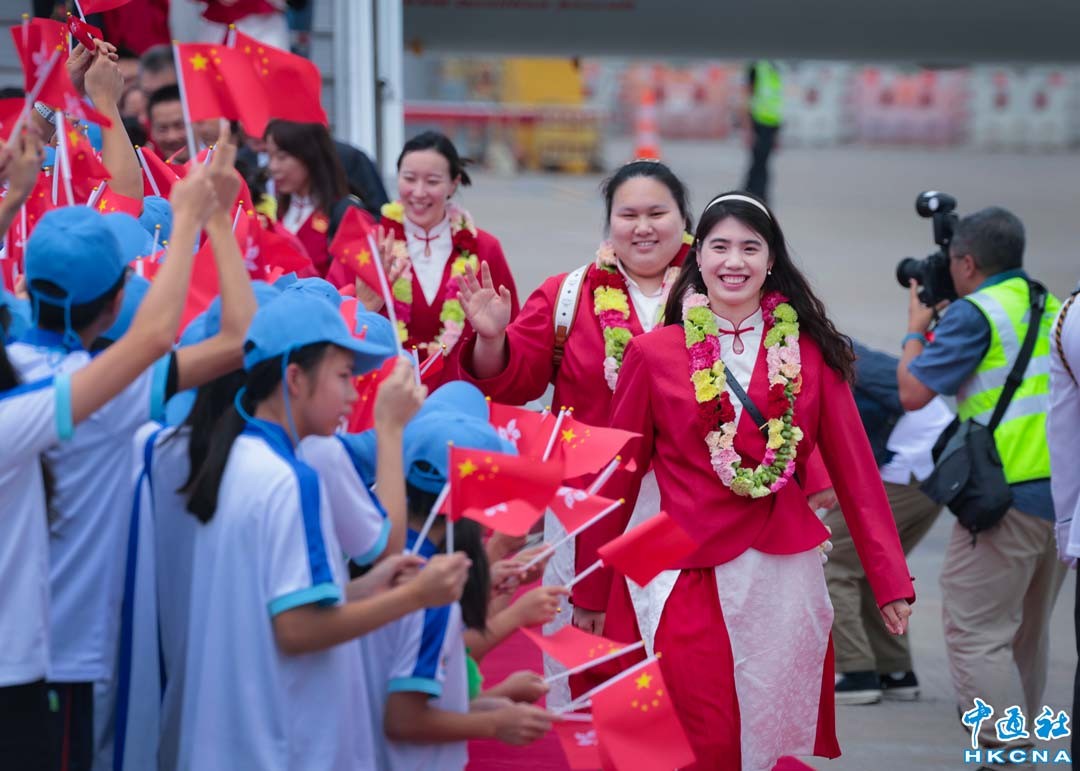 8月29日,香港特區政府在機場停機坪舉行歡迎儀式。當日,2024年巴黎奧運會內地奧運健兒代表團抵港,進行為期3天的訪問活動。圖為運動員張雨霏(前排)等向前來歡迎的學生揮手致意。(香港中通社記者 謝光磊攝)