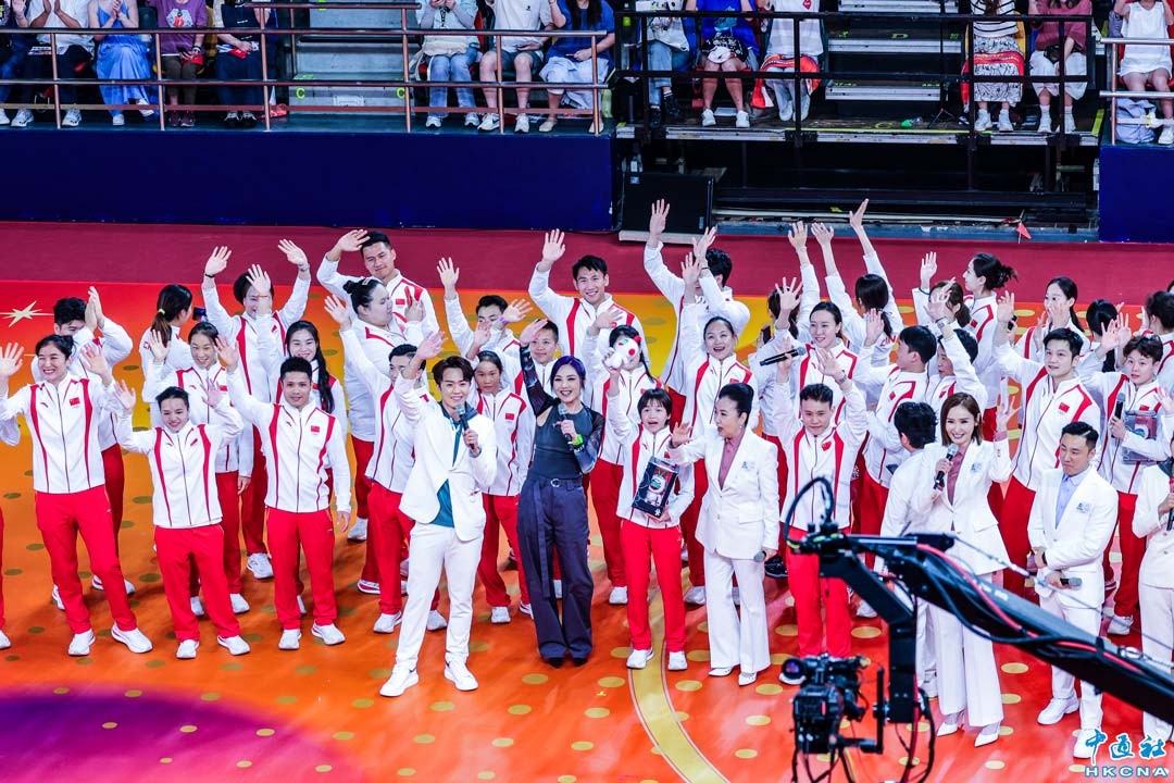 8月30日,2024年巴黎奧運會內地奧運健兒代表團在香港灣仔伊利沙伯體育館進行“奧運健兒大匯演”,藝人楊千嬅現身並演唱歌曲,與奧運健兒互動。(香港中通社記者 曹文毓攝)