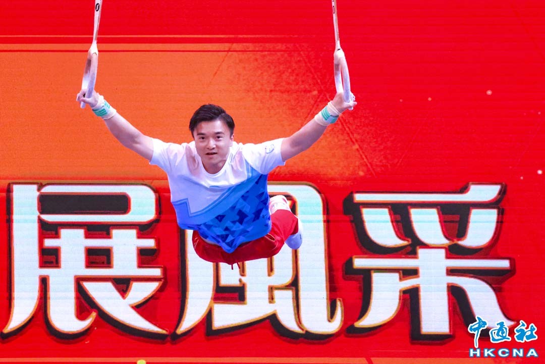 8月31日,巴黎奧運內地奧運健兒代表團展開本次最後一日訪港行程。上午,代表團部分成員在灣仔伊利沙伯體育館進行羽毛球、體操、乒乓球示範表演。圖為運動員劉洋示範吊環項目。(香港中通社記者 謝光磊攝)
