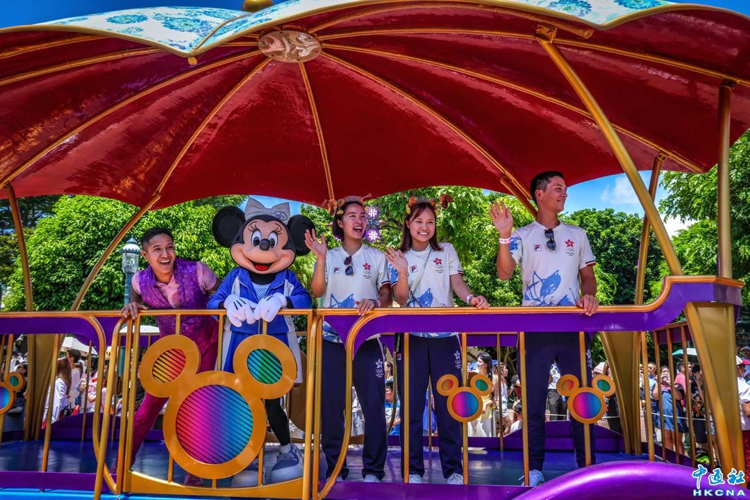 9月1日,2024年巴黎奧運中國香港代表團凱旋慶典於香港迪士尼樂園度假區舉行。圖為港隊運動員在慶祝巡遊中。(香港中通社記者 曹文毓攝)