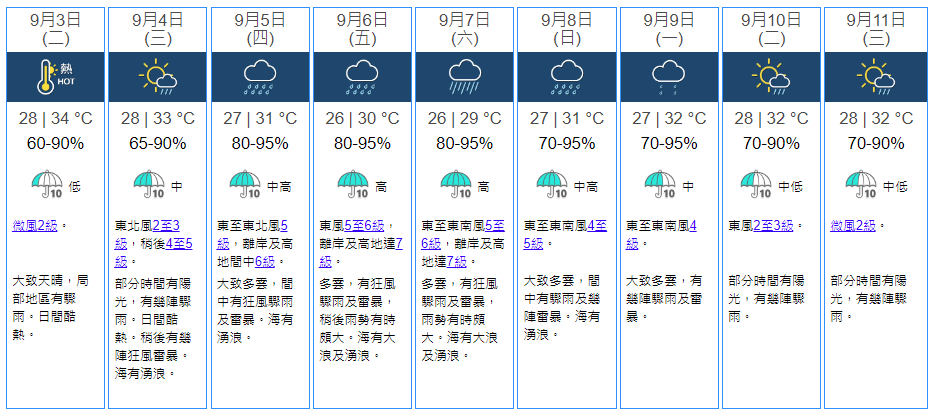 未來9天天氣預報。香港天文台圖 本港地區今日天氣方面,天文台預報指,今日(3日)大致天晴,局部地區有驟雨。日間酷熱,市區最高氣溫約34℃,新界再高1-2℃。吹微風。明日(4日)仍然酷熱,稍後有幾陣狂風雷暴。隨後兩三日天氣逐步轉壞,風勢頗大,有狂風驟雨,海有大浪及湧浪。 未來長期預報方面,天文台預料,熱帶氣旋摩羯會在未來兩三日逐漸靠近華南沿岸並進一步增強,較大機會移向廣東西部至海南島一帶。受其影響,本週後期廣東沿岸天氣轉壞,風勢頗大,有狂風大驟雨,海有大浪及湧浪。(完) 【編輯:豐悅】