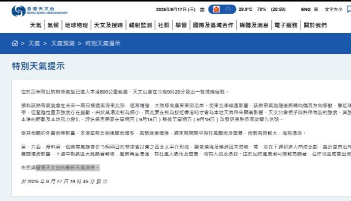 香港新聞網9月3日電 香港天文台今日(3日)早晨6點發佈特別天氣提示稱,熱帶氣旋“摩羯”已進入香港800公里範圍內,但目前仍與香港地區保持相當距離,尚未構成直接影響,天文台會考慮在今日(3日)下午至晚上發出一號戒備信號。另,香港天文台今晨繼續發佈酷熱天氣警告,提示高溫天氣持續,請市民注意防暑降溫。