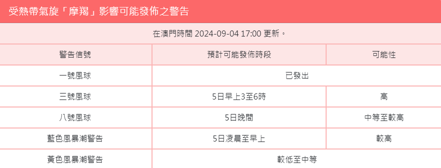 澳門氣象局圖片 澳門氣象局4日晚間表示,與“摩羯”相關的環流週四將開始影響珠江口,澳門日間風力將會逐步增強,雷雨漸趨頻密,周四早上3時至6時發出三號風球機會高。按照現時預測路徑,隨著“摩羯”有機會進一步增強為超強颱風,並於周五在澳門以南約300公里範圍內掠過,屆時風力將顯著快速增強,有頻密的大驟雨及雷暴,周四晚間發出八號風球的機會中等至較高。 另一方面,預料澳門內港低窪地區(6日約有0.5米以下水浸,發出藍色風暴潮警告機會較高。如“摩羯”採取更為偏北路徑或顯著增強,水浸情況可能更略為明顯,故不排除發出黃色風暴潮警告的可能。氣象局提醒巿民留意最新天氣資訊,並盡早做好防風防水浸措施。(完) 【編輯:陳卓儀】
