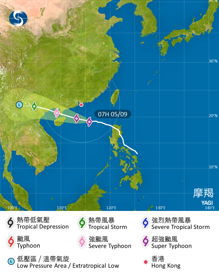 9月5日上午7時“摩羯”運動軌跡預測。圖自香港天文台 三號強風信號,現正生效。在上午8時,超強颱風“摩羯”集結在香港之東南偏南約390公里,即在北緯19.1度,東經115.7度附近,預料向西或西北偏西移動,時速約12公里,橫過南海北部。 香港天文台預料,“摩羯”發展成熟,受其外圍環流影響,今早本港普遍風力增強,高地間中吹烈風。按照現時預測路徑,“摩羯”將會在今晚(5日)至明早(6日)在本港西南300公里左右掠過。預料與“摩羯”相關的烈風區會在今日稍後靠近珠江口,本港普遍地區的風力會進一步增強,天氣轉壞,天文台會考慮在今日(5日)下午4時至7時之間改發八號烈風或暴風信號。 香港天文台提示,“摩羯”的外圍雨帶正影響廣東沿岸。在過去1小時,大老山、橫瀾島及青洲分別錄得的最高持續風速為每小時66、46及42公里,最高陣風分別超過每小時83、53及53公里。海面有大浪及湧浪,市民應遠離岸邊及停止所有水上活動。進行戶外工作或活動的市民亦請留意天氣變化。