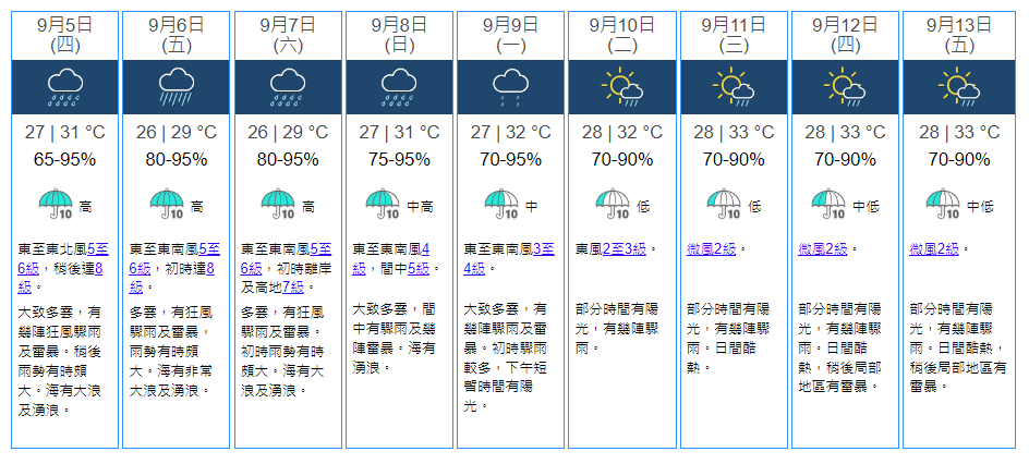 香港地區未來9天天氣預報。圖自香港天文台 今日天氣,天文台預測,本港將吹清勁至強風程度東至東北風,稍後風勢進一步增強,達烈風程度。大致多雲,有幾陣狂風驟雨及雷暴,最高氣溫約31度,稍後雨勢有時頗大。海有大浪及湧浪。 長期天氣方面,天文台預測,熱帶氣旋摩羯會在今明兩日橫過南海北部,大致移向雷州半島至海南島一帶。受摩羯影響,今明兩日廣東沿岸天氣轉壞,風勢頗大,有狂風大驟雨及雷暴,海有非常大浪及湧浪。隨著摩羯遠離及減弱,下週初華南沿岸驟雨逐漸減少。而下週中期廣東沿岸風勢微弱,該區天氣酷熱,高溫亦會觸發驟雨。同時,預料一個廣闊低壓區會為台灣以東海域帶來不穩定天氣。(完) 【編輯:許豐悅】