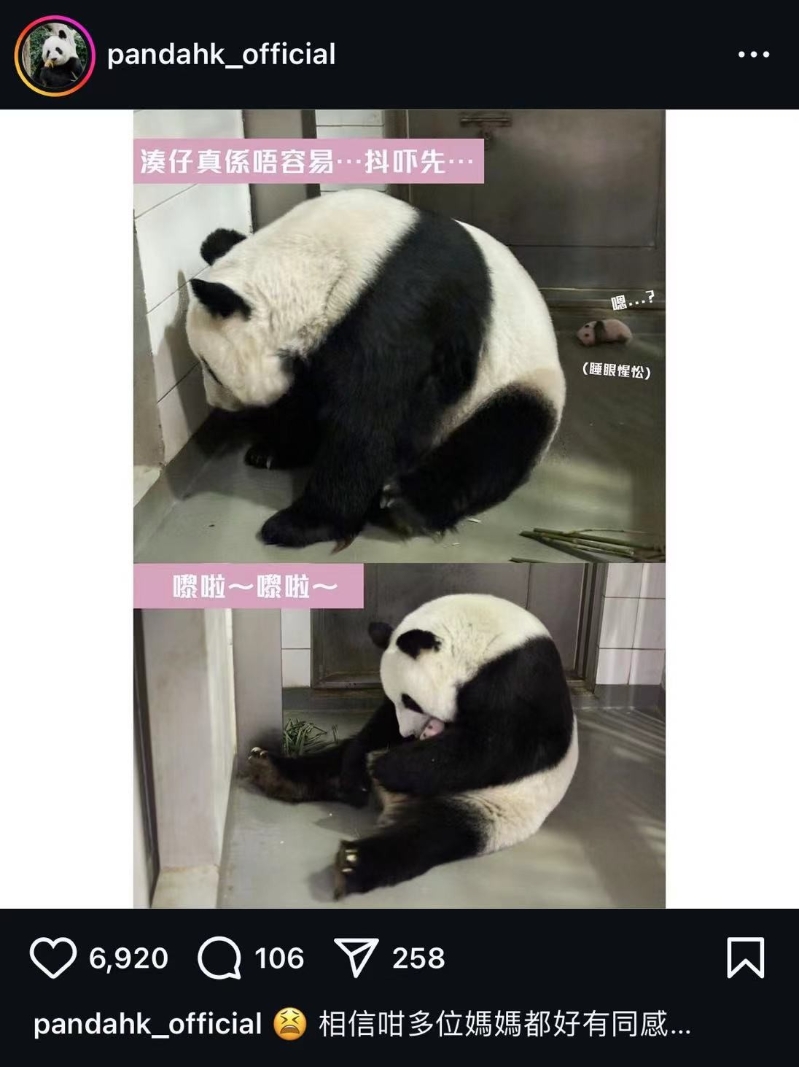 香港新聞網9月8日電 香港海洋公園8日發布大熊貓盈盈和龍鳳胎的最新相片,相片中盈盈正在“面壁”,圖片配字“照顧孩子真不容易”,海洋公園配文指:“相信各位媽媽都很有同感。”