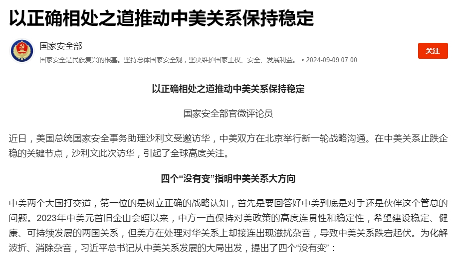 網站截圖 近日,美國總統國家安全事務助理沙利文受邀訪華,中美在北京舉行新一輪戰略溝通,引起全球高度關注。 中國國安部在文中指出,中美兩個大國打交道,首先要回答好中美到底是對手還是夥伴這個總的問題。為化解波折、消除雜音,中方從中美關係發展的大局出發,提出了四個“沒有變”:中方致力於中美關係穩定、健康、可持續發展的目標沒有變;中方按照相互尊重、和平共處、合作共贏處理中美關係的原則沒有變;中方堅定維護自身主權、安全、發展利益的立場沒有變;中方賡續中美人民傳統友誼的努力沒有變。 去年以來,中美雙方分別在維也納、馬爾他、曼谷和北京進行了四輪戰略溝通。此次戰略溝通中方提出了保持兩國關係穩定發展的五個“關鍵”,分別是:中美關係要保持正確方向,關鍵在於兩國元首把舵引航;中美兩國要避免衝突對抗,關鍵在於遵守三個聯合公報;中美互動要順利開展,關鍵在於平等相待;中美關係要行穩致遠,關鍵在於鞏固民意基礎;中美雙方要實現和平共處,關鍵在於樹立正確認知。 這次戰略溝通,中方不僅針對兩國關係發展“劃重點”,還在敏感問題上“定基調”“立規矩”,提出三個“不”,構建中美關係的“防火牆”。 第一,“紅線”不能逾越。台灣問題是中美關係第一條不可逾越的紅線。美方應當把不支持“台獨”的承諾落到實處,恪守一個中國原則和中美三個聯合公報,停止美台軍事勾連,停止武裝台灣。 第二,“主權”不容置疑。中國堅定維護對南海諸島的領土主權和海洋權益。美國不得以雙邊條約為藉口損害中國的主權和領土完整,不得支持縱容菲律賓採取侵權行為。 第三,“國家安全”不能泛化。國家安全需要有明確邊界,特別是在經濟領域更要科學界定。美方應停止在經貿和科技領域打壓中國,停止損害中方正當利益。 文章最後表示,希望美方同中方相向而行,視彼此的發展為機遇而不是挑戰,同中方一道,找到中美兩個不同文明、不同制度、不同道路國家在地球上和平共處、共同發展的正確相處之道,推動中美關係保持穩定,並在此基礎上,爭取好起來、向前走。(完) 【編輯:淩玉輝】