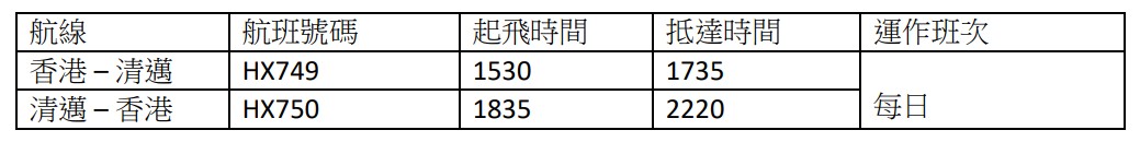 香港航空往來香港至清邁航班詳情。 【編輯:黃璇】