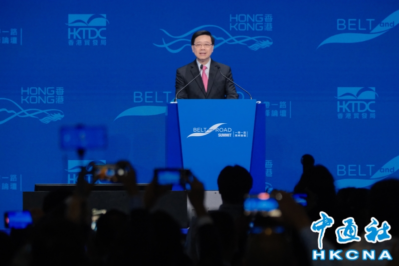 圖為香港特區行政長官李家超致開幕辭。(香港中通社記者 許其皓攝) 香港中通社圖片 李家超表示,“一帶一路”倡議踏入新一個黃金十年,過去十年間,香港和內地以外的“一帶一路”經濟體對外貿易增近六成,有關經濟體佔香港外貿價值超過43%,反映“一帶一路”貿易對香港有巨大影響。香港作為中國最開放的國際城市,在實現“一帶一路”倡議中扮演重要角色;作為超級連繫人和超級增值人,提供世界級基建及專業服務貿易支援,香港亦是自由及多邊貿易的堅定支持者。