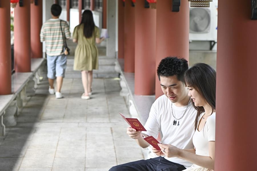 2023年8月22日,廣東省廣州市花都區民政局婚姻登記處,一對新人查看結婚證。 香港中通社圖片 第一財經報道稱,記者梳理數據發現,2023年中國結婚人數為近十年來首次回升,并且超過了2021年的結婚人數(764.3 萬對)。 有專家分析稱,2023年結婚人數增幅超過一成,幅度比較大,主要原因是,2022年尤其是第四季度受疫情等因素影響,一部分人推遲到2023年結婚。 記者梳理公報公佈的2023年結婚登記人口年齡分布數據發現,去年結婚人口中,25至29歲年齡段結婚人數最多,佔比達到38%,自2013年開始,連續11年成為佔比最高的年齡段。此外,去年結婚人口中,20至24歲年齡段佔比為13.8%,30至34歲年齡段佔比為21.1%。 今年8月12日,中國民政部發佈了關於《婚姻登記條例(修訂草案征求意見稿)》的公開征求意見通知,意見反饋截止時間為9月11日。 修訂草案征求意見稿中提出了多項改革措施,其中婚姻登記取消戶口簿等新規定引起廣泛關注。 據新華社報道,8月16日,中國民政部有關司局負責人就修訂草案征求意見稿有關內容進行了解讀。中國民政部有關司局負責人表示,這次修訂《婚姻登記條例》取消當事人需要出具戶口簿的規定,主要是從人口流動客觀規律出發,推動相關公共服務隨人走。 這位負責人介紹稱,現行條例中規定婚姻登記需到一方當事人常住戶口所在地的婚姻登記機關辦理,居民戶口簿是其有效證明材料。隨著經濟社會的快速發展,人口流動性增加,越來越多的人選擇在異地工作和生活,現有規定給他們辦理婚姻登記帶來很多限制,回戶籍地辦理登記無形中也增加了額外負擔,取消當事人提供戶口簿的規定則解決了這個難題。 整體來看,取消婚姻登記需要出具戶口簿的規定,不用再回戶籍地辦理登記。這對於長期在非戶籍地工作的人們來說,進行婚姻登記更加方便。同時,也更能滿足一些個性化的需求。 有分析指出,這一些對婚姻登記地比如相遇地、初戀地、定情地、上學地、創業地等情有獨鐘的個性化婚姻登記需求也能得到滿足。 同時,近年來結婚登記場景也越來越多樣化。一些地方將婚姻登記服務中心開進公園、旅遊景區、商場等場所,為婚姻登記提供方便。(完) 【編輯:丘志彬】