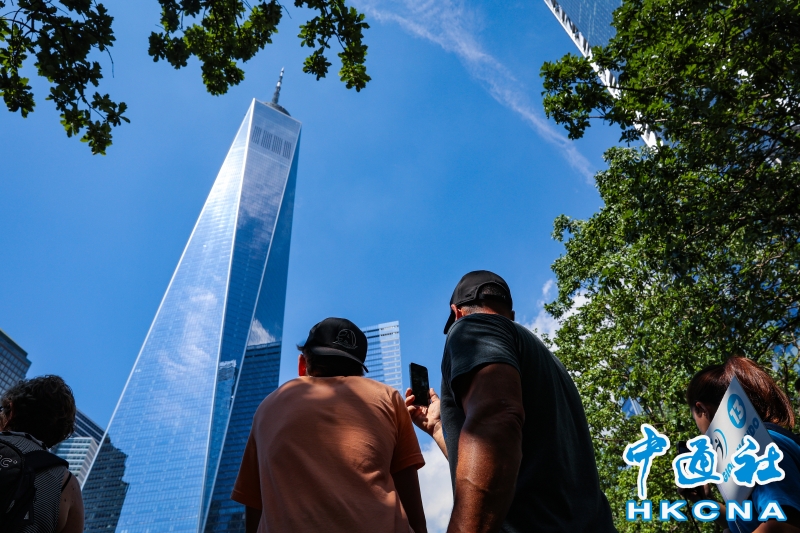 資料圖為在世貿中心遺址上重建的新世貿中心一號大樓。(香港中通社記者 徐文峰攝) 香港中通社圖片 美國總統拜登、副總統哈里斯與多名官員,當日到紐約的世貿中心遺址出席紀念儀式,期間哈里斯與前一天在電視辯論交鋒的前總統特朗普握手並短暫交談。在儀式中,死難者家屬分批上台,宣讀死者名字。