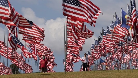 資料圖為刻著911罹難者名字的石碑插著美國國旗。(香港中通社記者 徐文峰攝) 香港中通社圖片 拜登與哈里斯隨後又轉往賓夕法尼亞州尚克斯維爾,獻花悼念襲擊當日墜毀的聯合航空93號航班死者。兩人之後返回華盛頓,到國防部五角大樓與國防部長奧斯汀獻花悼念當日在五角大樓遇襲喪生的人。奧斯汀表示,可能很多美國人已不再出席911悼念活動,但國防部會牢記死去的同僚。 2001年9月11日,19名恐怖分子騎劫四架客機,先後撞向世貿中心雙子塔、五角大樓及賓夕法尼亞州,造成近3000人遇難。(完) 【編輯:紀東】