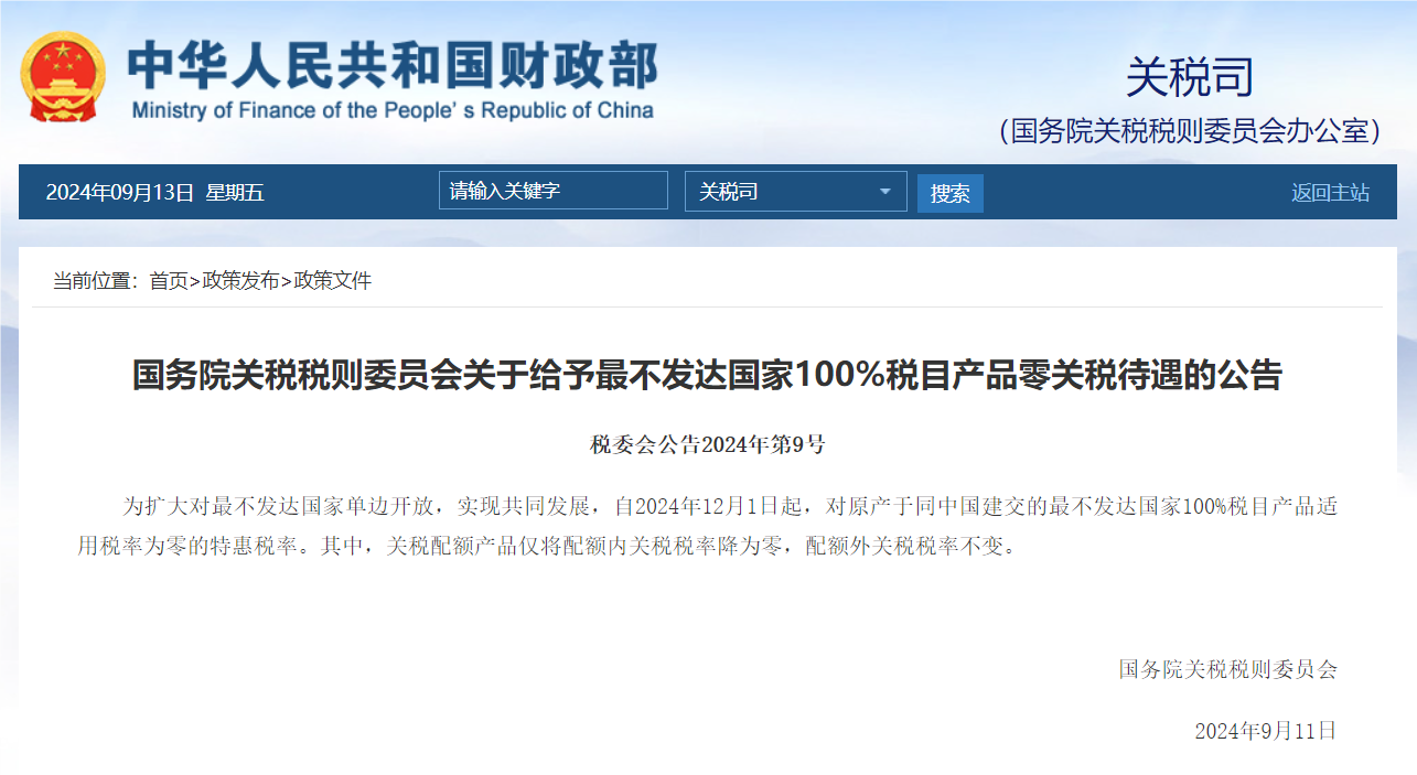香港新聞網9月13日電 據中國財政部網站9月12日消息,中國國務院關稅稅則委員會日前發佈公告稱,為擴大對最不發達國家單邊開放,實現共同發展,自2024年12月1日起,對原產於同中國建交的最不發達國家100%稅目產品適用稅率為零的特惠稅率。其中,關稅配額產品僅將配額內關稅稅率降為零,配額外關稅稅率不變。