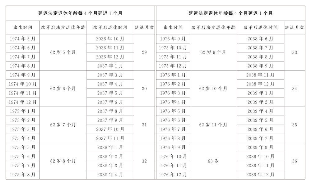 中國將逐步延遲男性退休年齡至63歲 女性至55歲或58歲香港新聞網9月13日電 9月13日,中國第十四屆全國人民代表大會常務委員會第十一次會議通過了《關於實施漸進式延遲法定退休年齡的決定》,本決定自2025年1月1日起施行。 全文如下: 全國人民代表大會常務委員會關於實施漸進式延遲法定退休年齡的決定 (2024年9月13日第十四屆全國人民代表大會常務委員會第十一次會議通過) 為了深入貫徹落實黨中央關於漸進式延遲法定退休年齡的決策部署,適應我國人口發展新形勢,充分開發利用人力資源,根據憲法,第十四屆全國人民代表大會常務委員會第十一次會議決定: 一、同步啟動延遲男、女職工的法定退休年齡,用十五年時間,逐步將男職工的法定退休年齡從原六十周歲延遲至六十三周歲,將女職工的法定退休年齡從原五十周歲、五十五周歲分別延遲至五十五周歲、五十八周歲。 二、實施漸進式延遲法定退休年齡堅持小步調整、彈性實施、分類推進、統籌兼顧的原則。 三、各級人民政府應當積極應對人口老齡化,鼓勵和支持勞動者就業創業,切實保障勞動者權益,協調推進養老托育等相關工作。 四、批准《國務院關於漸進式延遲法定退休年齡的辦法》。國務院根據實際需要,可以對落實本辦法進行補充和細化。 五、本決定自2025年1月1日起施行。第五屆全國人民代表大會常務委員會第二次會議批准的《國務院關於安置老弱病殘幹部的暫行辦法》和《國務院關於工人退休、退職的暫行辦法》中有關退休年齡的規定不再施行。 國務院關於漸進式延遲法定退休年齡的辦法 堅持以習近平新時代中國特色社會主義思想為指導,深入貫徹黨的二十大和二十屆二中、三中全會精神,綜合考慮我國人均預期壽命、健康水平、人口結構、國民受教育程度、勞動力供給等因素,按照小步調整、彈性實施、分類推進、統籌兼顧的原則,實施漸進式延遲法定退休年齡。為了做好這項工作,特制定本辦法。 第一條 從2025年1月1日起,男職工和原法定退休年齡為五十五周歲的女職工,法定退休年齡每四個月延遲一個月,分別逐步延遲至六十三周歲和五十八周歲;原法定退休年齡為五十周歲的女職工,法定退休年齡每二個月延遲一個月,逐步延遲至五十五周歲。國家另有規定的,從其規定。 第二條 從2030年1月1日起,將職工按月領取基本養老金最低繳費年限由十五年逐步提高至二十年,每年提高六個月。職工達到法定退休年齡但不滿最低繳費年限的,可以按照規定通過延長繳費或者一次性繳費的辦法達到最低繳費年限,按月領取基本養老金。 第三條 職工達到最低繳費年限,可以自願選擇彈性提前退休,提前時間最長不超過三年,且退休年齡不得低於女職工五十周歲、五十五周歲及男職工六十周歲的原法定退休年齡。職工達到法定退休年齡,所在單位與職工協商一致的,可以彈性延遲退休,延遲時間最長不超過三年。國家另有規定的,從其規定。實施中不得違背職工意願,違法強制或者變相強制職工選擇退休年齡。 第四條 國家健全養老保險激勵機制。鼓勵職工長繳多得、多繳多得、晚退多得。基礎養老金計發比例與個人累計繳費年限掛鈎,基礎養老金計發基數與個人實際繳費掛鈎,個人賬戶養老金根據個人退休年齡、個人賬戶儲存額等因素確定。 第五條 國家實施就業優先戰略,促進高質量充分就業。完善就業公共服務體系,健全終身職業技能培訓制度。支持青年人就業創業,強化大齡勞動者就業崗位開發,完善困難人員就業援助制度。加強對就業年齡歧視的防範和治理,激勵用人單位吸納更多大齡勞動者就業。 第六條 用人單位招用超過法定退休年齡的勞動者,應當保障勞動者獲得勞動報酬、休息休假、勞動安全衛生、工傷保障等基本權益。 國家加強靈活就業和新就業形態勞動者權益保障。 國家完善帶薪年休假制度。 第七條 對領取失業保險金且距法定退休年齡不足一年的人員,領取失業保險金年限延長至法定退休年齡,在實施漸進式延遲法定退休年齡期間,由失業保險基金按照規定為其繳納養老保險費。 第八條 國家規範完善特殊工種等提前退休政策。從事井下、高空、高溫、特別繁重體力勞動等國家規定的特殊工種,以及在高海拔地區工作的職工,符合條件的可以申請提前退休。 第九條 國家建立居家社區機構相協調、醫養康養相結合的養老服務體系,大力發展普惠托育服務體系。 附件 1.男職工延遲法定退休年齡對照表 2.原法定退休年齡五十五周歲的女職工延遲法定退休年齡對照表 3.原法定退休年齡五十周歲的女職工延遲法定退休年齡對照表 4.提高最低繳費年限情況表