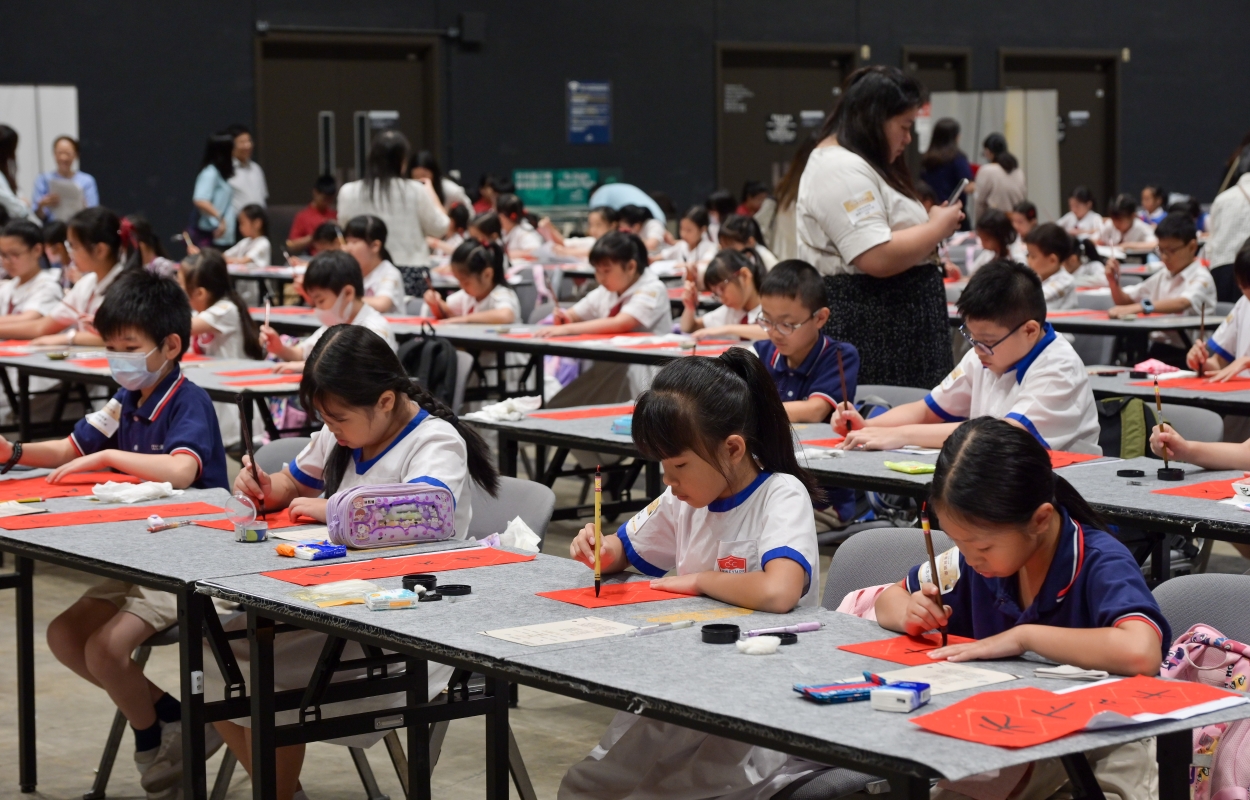 圖源:政府新聞處 施俊輝致辭時說:“中華文化源遠流長,優秀的傳統文化是我們發展的穩固根基。因此我們在不斷向前邁進的同時,也要繼承和弘揚中華民族的優秀文化。書法藝術是中華文化的瑰寶之一。它不僅是一種藝術形式,也是修養品德的途徑。同學在書寫的過程中,可以感受筆觸的變化,思考章法布局,領略書寫的意趣,並且沉澱心靈,陶冶性情,慢慢地就提高了審美能力和文化內涵。” 逾1800位來自81所小學、61所中學的學生、300位校長、教師及嘉賓一起參與活動。除了現場參加的學生外,還有部分學校以校本方式,同步參與活動。另外,超過100位來自教育局、政務司司長辦公室及法律援助署義工隊的隊員在場協助,展現政府跨部門合作的精神。 一眾嘉賓、校長和師生一起即席揮毫,千筆共舞,氣勢非凡,場面壯觀,共同交織出一幅同賀國慶的偉大傑作,不僅展現了大家對書法藝術的深切熱愛,更表達了香港學界對偉大祖國的美好祝福,並願意一起攜手協力,同心同德,為祖國繁榮進步而竭盡全力。 是次活動邀請到香港島校長聯會、九龍地域校長聯會,以及新界校長會為支持機構。所有參與活動的學生都會獲得參與證書,大會並會挑選75件優秀的學生作品,予以嘉獎及展覽。 (完) 【編輯:譚暢】