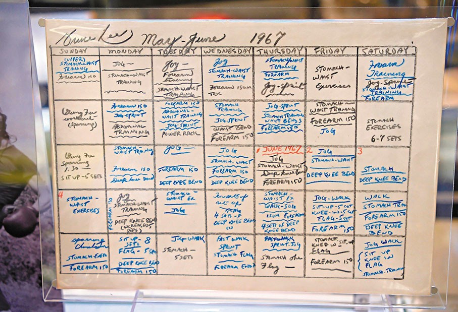 李小龍1967年5月至6月的日程表,寫滿了訓練計劃。 李小龍的職業生涯及其魅力對全球的華人和美國亞裔社區產生了深遠的影響。出生於三藩市的他回到香港發展,參演了多部經典影片,如《唐山大兄》、《精武門》和《猛龍過江》,最終成為國際知名的武打明星。