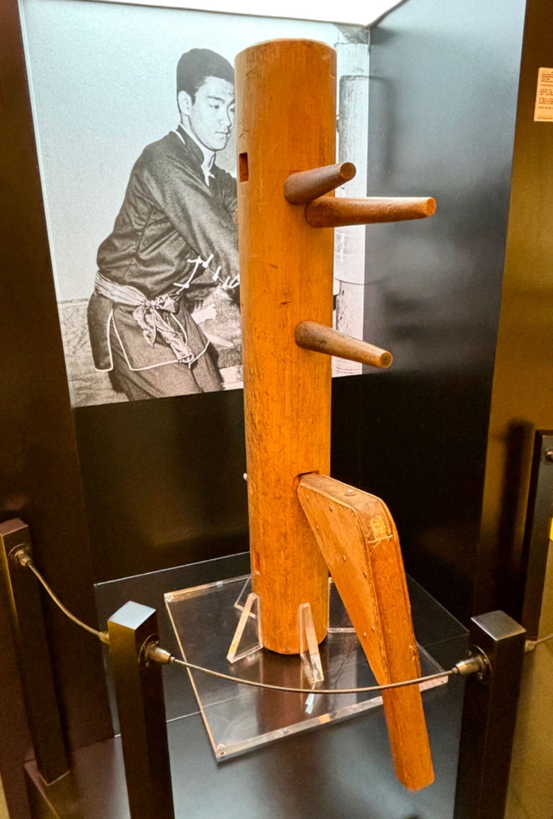 李小龍訂製並使用過的木人樁。(香港中通社記者 黃璇攝) 展覽的入口處展示著李小龍親自訂製並使用的木人樁,這是他練習詠春拳的重要工具。在他去世後,這件木人樁由好友及前學生木村武之(Taky Kimura)保留,並曾在西雅圖的武術學校中使用。 展覽中還包括李小龍在《精武門》中使用的雙節棍,這副道具是根據他的要求製作的,並在影片中擊敗了多位對手,設計獨特且具有代表性。此外,展品還有出現在《龍爭虎鬥》中的格鬥拳套和李小龍使用的武術雙戟,這些物品都意義非凡。 此外,展覽還展示了李小龍拍攝期間穿著的服裝,包括在《唐山大兄》中穿的白色短袖和長袖襯衫,以及在《龍爭虎鬥》幕後穿的黑色功夫外套。每件展品旁都有相關的電影劇照或資料,讓觀眾重溫李小龍的經典瞬間。