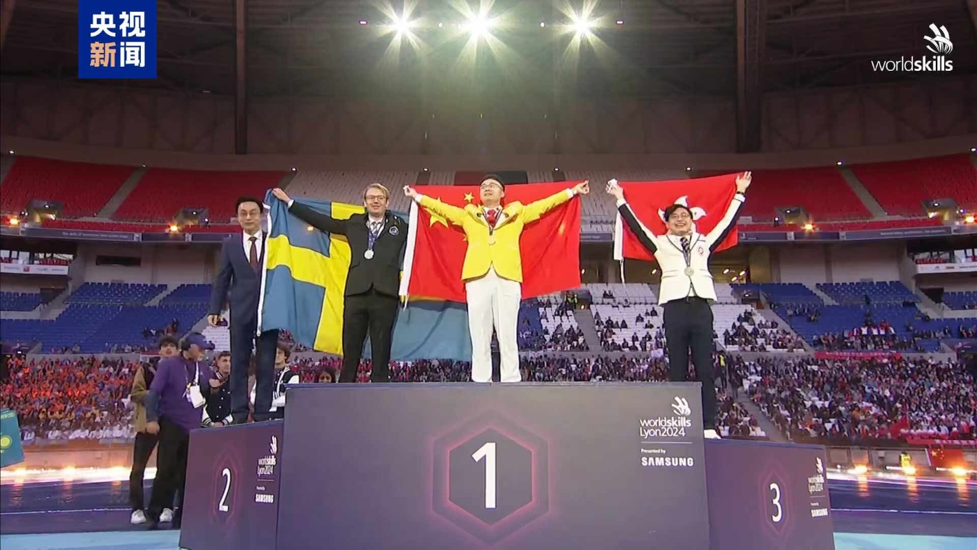 中間為飛機維修項目金牌獲得者:中國選手唐凡(圖源:央視新聞) 獲得金牌的項目是飛機維修、車身修理、數控銑項目、電子技術、自主移動機器人、砌築、電氣裝置、時裝技術等。其中,數控銑項目實現金牌“五連冠”,砌築、時裝技術等兩個項目實現金牌“四連冠”,電氣裝置、電子技術、自主移動機器人等三個項目實現金牌“三連冠”。 閉幕式上,中國上海作為第48屆世界技能大賽的舉辦地,與法國里昂進行了世界技能大賽會旗交接,標誌著第48屆世界技能大賽正式進入“中國時間”“上海時段”,上海市呈現了以“技能創造美好未來”為主題的文藝表演。 世界技能大賽每兩年舉辦一屆,是當今世界地位最高、規模最大、影響力最大的職業技能賽事,被譽為“世界技能奧林匹克”,代表了職業技能發展的世界先進水平,是世界技能組織成員展示和交流職業技能的重要平台。 中國2010年加入世界技能組織,2011年首次參加世界技能大賽,累計獲得93枚金牌、41枚銀牌、28枚銅牌和71個優勝獎。第47屆世界技能大賽於9月10日至15日在法國里昂舉行,來自世界技能組織各成員國家和地區的1400餘名選手參與同場競技。(完) 【編輯:丘志彬】