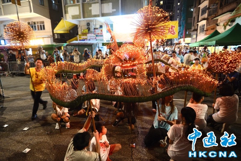 香港中通社9月16日電(香港中通社記者 徐嘉儀)16日(農曆八月十四日)中秋迎月夜起,百多年歷史的香港傳統習俗大坑舞火龍一連三晚舉行。歡快鑼鼓聲中,插滿數萬支長壽線香的“火龍”由數百位健兒交替舞動,穿過銅鑼灣大坑一帶的大街小巷;沿途遊客、市民煙熏火燎中盡情高呼,感受港式中秋的魅力。