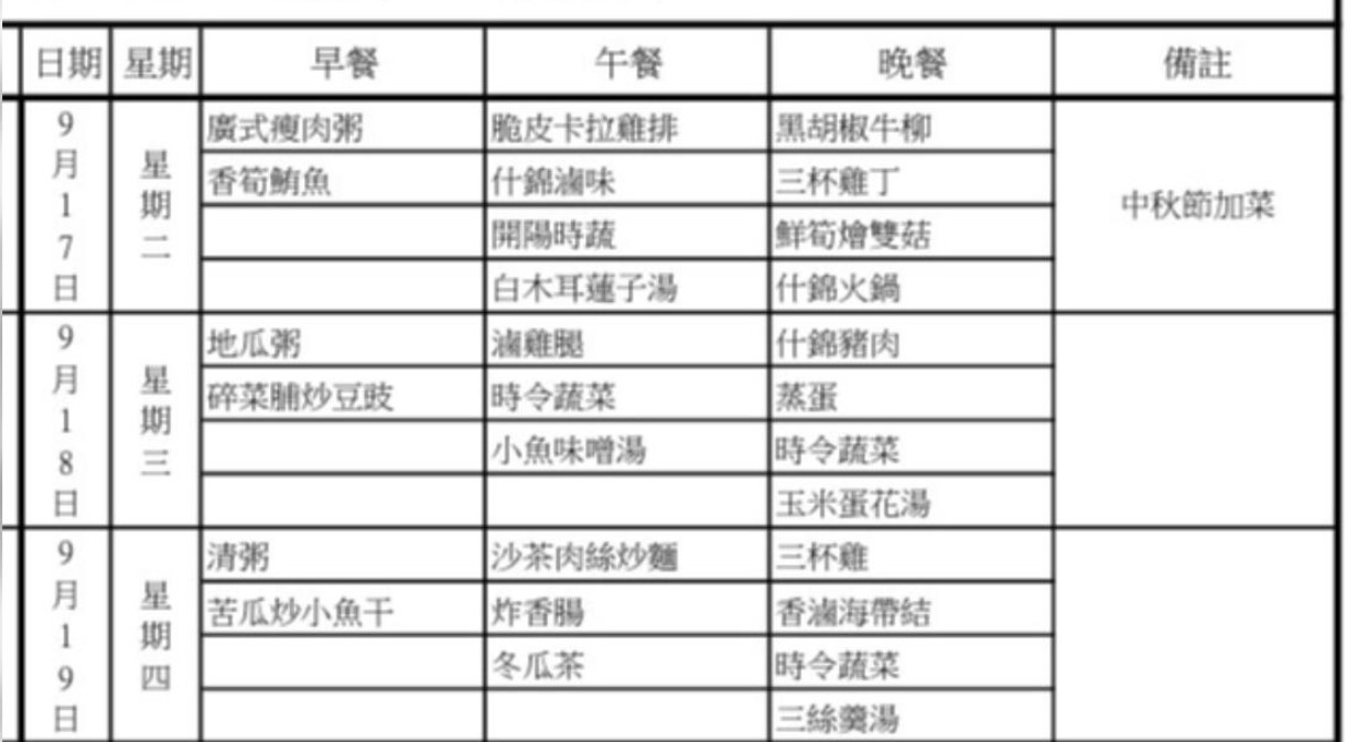 台北看守所今天的特別菜色標示為“中秋節加菜”。(圖源:台北看守所官網) 根據台北看守所公開的9月份菜單,今天的特別菜色標示為“中秋節加菜”。早餐方面,提供廣式瘦肉粥搭配香筍鮪魚;午餐則有脆皮卡拉雞排、什錦滷味、開陽時蔬和白木耳蓮子湯。晚餐菜色更為豐富,包含黑胡椒牛柳、三杯雞丁、鮮筍燴雙菇以及什錦火鍋。 菜單曝光後,台灣網友在論壇上熱烈討論,“阿北(柯文哲)中秋節有火鍋吃欸!”許多人對柯文哲在獄中度過中秋表示關注,評論包括“監獄的火鍋應該很像廚餘桶”、“怎麼感覺比很多上班族吃得好”、“晚上沒冷氣吃火鍋,這我還真的不行”、“沒有月餅嗎?”以及“中秋加菜賺到了”。(完) 【編輯:黃璇】