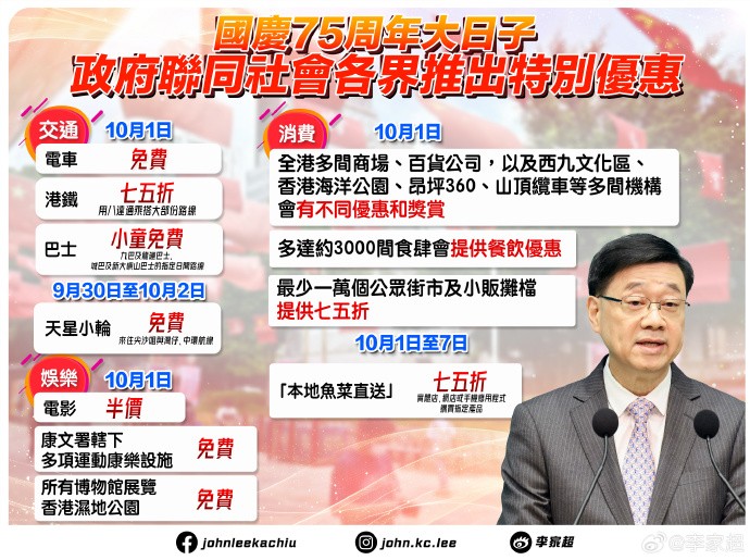 (圖源:李家超微博) 第三是與眾同樂,特區政府將於10月1日透過電影發展基金,資助市民半價看電影。另外會聯同社會各界推出各式各樣的優惠,為方便市民出行,所有乘客於國慶當日可免費搭電車,以八達通乘坐港鐵大部分路線享受七五折,小童亦可免費乘搭九巴、龍運巴士、城巴及新大嶼山巴士的指定日間路線;9月30日至10月2日期間,市民可免費乘搭天星小輪尖沙咀來往灣仔及中環航線;康文署轄下多個康體設施、博物館展覽、香港濕地公園國慶當日亦免費開放。 此外,香港多間商場、百貨公司、西九文化區、香港海洋公園、昂坪360、山頂纜車等國慶當日會推出不同優惠及獎賞;約3000間食肆當日亦會提供餐飲優惠;至少1萬個公眾街市及小販攤檔提供購物七五折優惠;10月1日至7日期間,“本地魚菜直送”實體店、網店及手機應用程式購買指定產品享七五折。 今日稍晚時間,政務司司長陳國基將聯同相關司局長等舉行記者會,詳細介紹今年國慶精彩慶祝活動。(完) 【編輯:劉春】