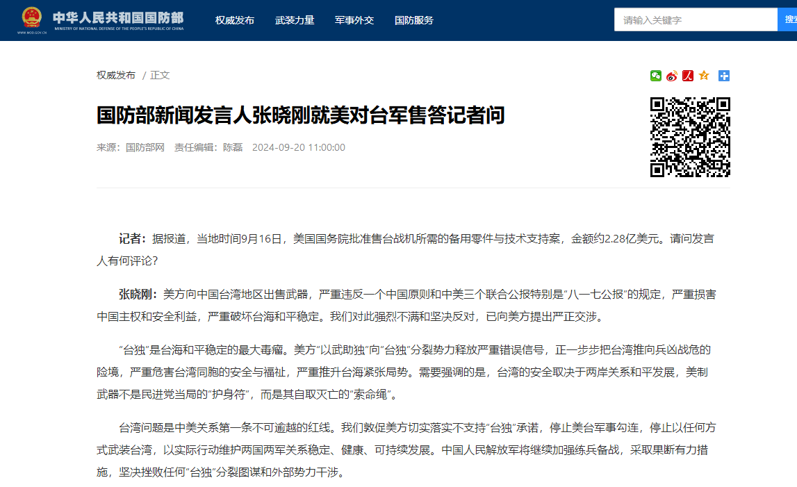 香港中通社9月20日電 美國國務院當地時間16日批准售台戰機所需的備用零件與技術支持案,金額約2.28億美元。中國國防部新聞發言人張曉剛20日說,我們對此強烈不滿和堅決反對,已向美方提出嚴正交涉。