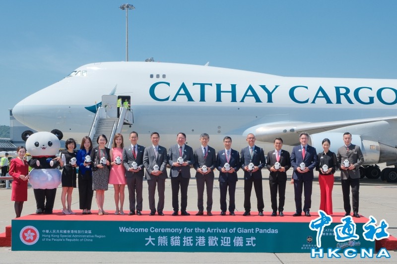 特區政府在香港國際機場舉行大熊貓抵港歡迎儀式。(香港中通社記者 許其皓攝) 香港特區政府在機場舉行歡迎大熊貓儀式,特區政府政務司司長陳國基、文化體育及旅遊局局長楊潤雄出席儀式,迎接牠們的到來。陳國基致辭表示,他同所有香港市民一樣雀躍,熱切期待大熊貓早日加入香港這個大家庭,可謂“喜上加喜”。 這對大熊貓於26日凌晨時分,從中國大熊貓保護研究中心都江堰基地出發,乘專車前往四川雙流機場。出發前,熊貓中心準備了充足的胡蘿蔔、竹筍、窩頭、蘋果等食物,以及大量的飲用水。 為預防緊急情況,飛機上還準備了藥品,包括鎮靜及消炎藥等,同時派出經驗豐富的飼養員和獸醫。香港海洋公園亦有前赴四川迎接的飼養員、獸醫,全方位陪同大熊貓前往香港。
