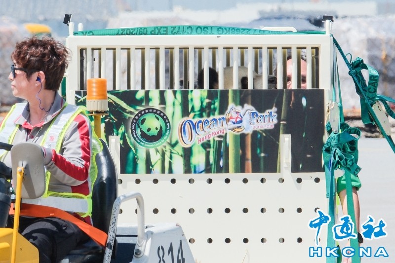 香港中通社9月26日電(香港中通社記者 譚暢)中央贈港一對大熊貓“安安”及“可可”,於26日中午落地香港國際機場。牠們一路乘坐專車,緩緩駛進海洋公園。這對大熊貓將進行隔離檢疫,有希望聖誕節時與市民見面。 天朗氣清,大熊貓中午下飛機後便直接向新“家”出發。中通社記者在海洋公園外看到,專車兩側印有大熊貓的圖樣,車廂一側加開小門和窗;專車前、後有車輛引路、護航,帥氣的騎警整齊排列,格外吸引人。 車未駛入園內,街道兩側已響起熱烈歡呼音樂聲,員工手持熊貓標牌、熊貓扇子、頭戴熊貓套,現場還有園內其他的動物朋友玩偶、氣球,一起夾道歡迎這對國寶進園安家。 大熊貓將在四川奇珍館內適應環境。香港海洋公園主席龐建貽向在場大批傳媒表示,希望牠們在聖誕節可與市民遊客見面。海洋公園將推出與大熊貓有關的飲食產品,助拓商機。 香港與大熊貓緣分頗深。中央贈港首對大熊貓“安安”與“佳佳”1999年抵港,現已安然離世;第二對大熊貓“盈盈”“樂樂”2007年來香港安家,今年8月誕下龍鳳胎。加上新來的“安安”及“可可”,香港已擁有6隻大熊貓。