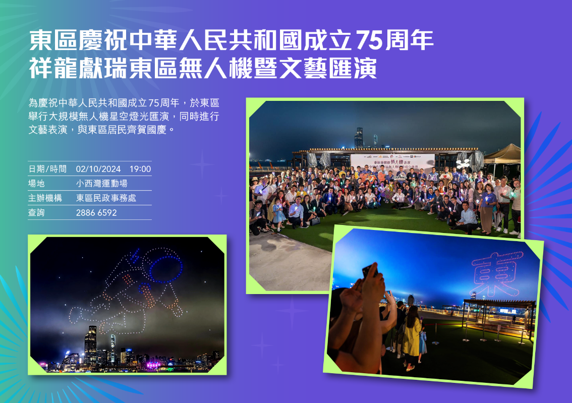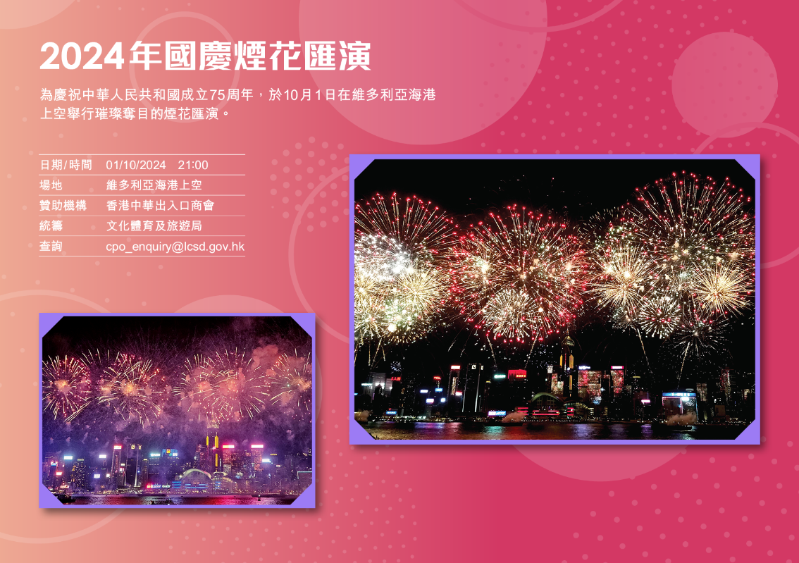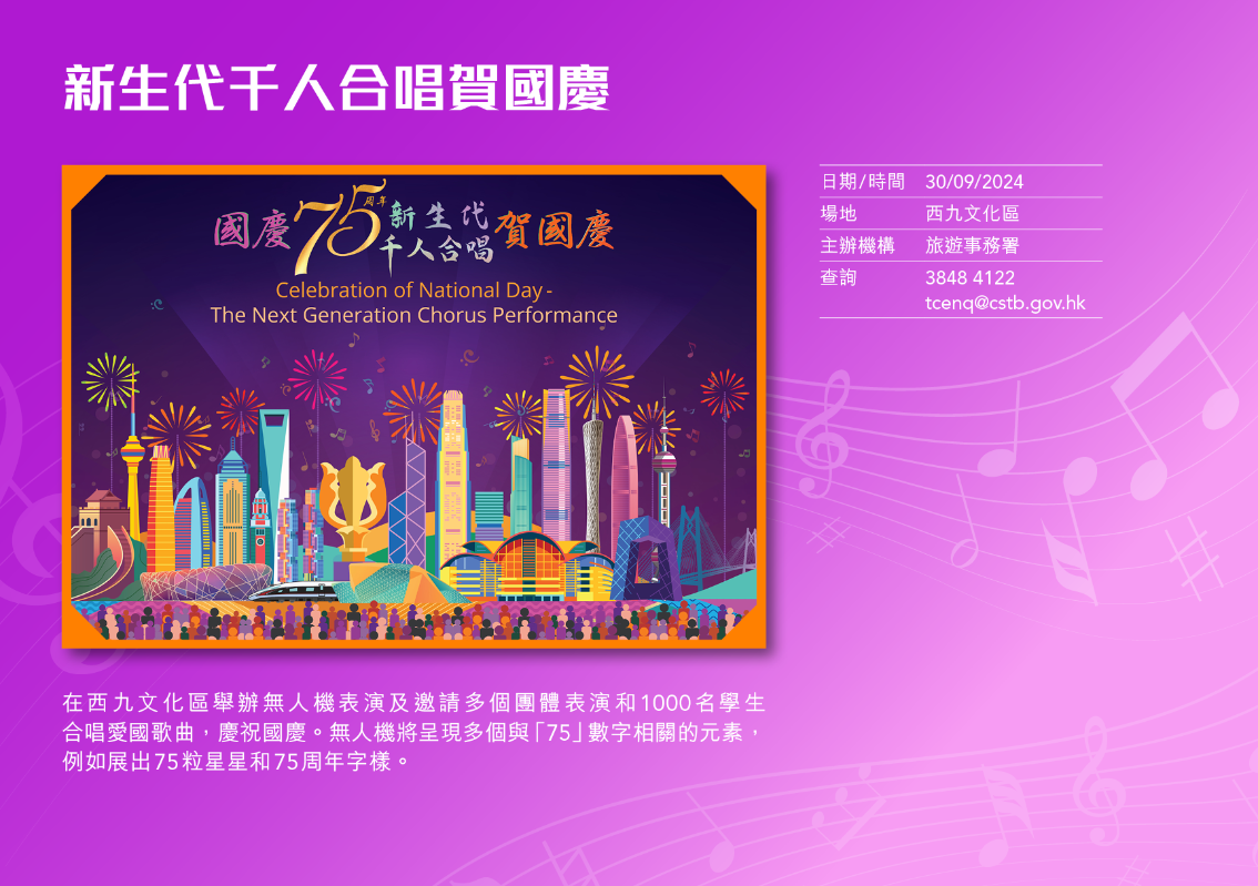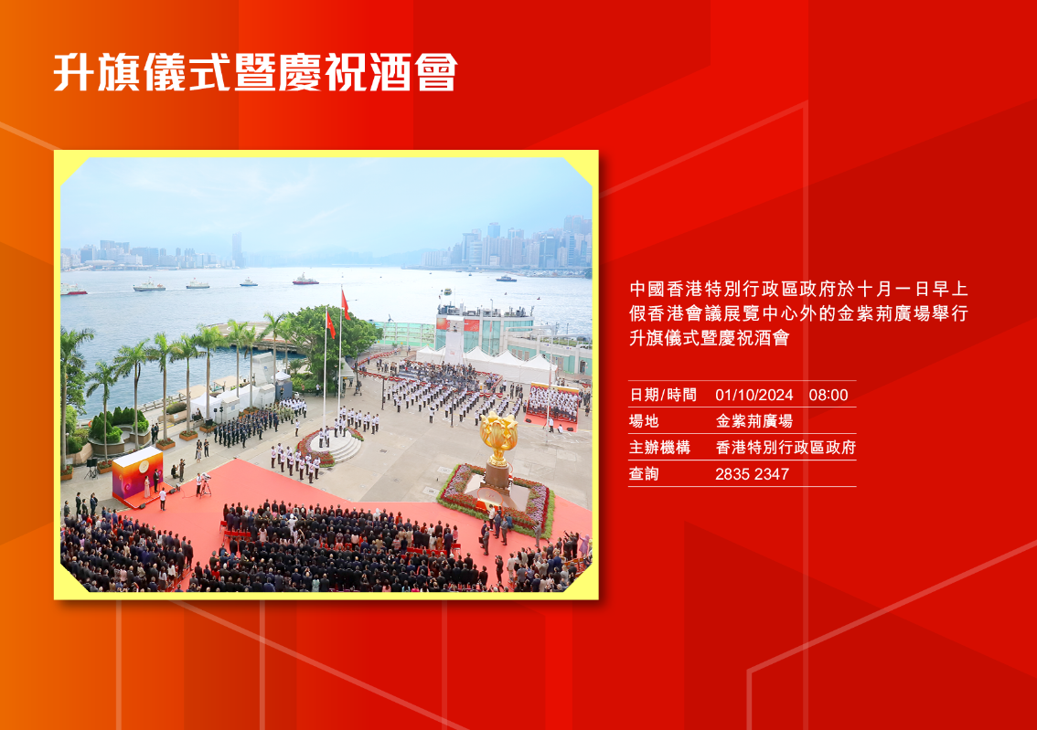 圖源:熱烈慶祝中華人民共和國成立75周年專題網站 慶祝活動 陳國基表示,國慶七十五周年是國家發展的重要里程碑。今年的國慶亦是特區政府完善地區治理、完成《基本法》第23條立法後的首個國慶,別具意義。特區政府全力籌備一系列豐富、多元、別具創意的國慶慶祝活動,與香港市民一同分享國慶的喜悅。 國慶日早上,特區政府會舉行升旗儀式和國慶酒會,並於當晚在維多利亞港兩岸舉辦大型煙花匯演;在國慶日前夕9月30日的晚上,西九文化區戶外區域會舉辦別出心裁的“新生代千人合唱賀國慶”活動,配合破紀錄的2099架(即2024年的“2024”,與國慶75周年的“75”相加)無人機表演,與香港市民共同慶祝國慶;“香港同胞慶祝中華人民共和國成立七十五周年文藝晚會”則於10月2日晚7時在紅磡香港體育館舉行;“金龍獻瑞賀國慶、彩馬呈祥耀中華”大型花燈展覽會於9月下旬推出。 紮作技藝被列入“香港非物質文化遺產代表作名錄”,是中華文化的一個組成部分。此次展覽以金龍獻瑞,彩馬呈祥為題,呈現生氣盎然的景象,寄寓祖國富強昌盛。最特別之處,是花燈紮有多達7500個象徵如意吉祥的如意結,代表香港市民在國慶75周年對祖國的祝福。
