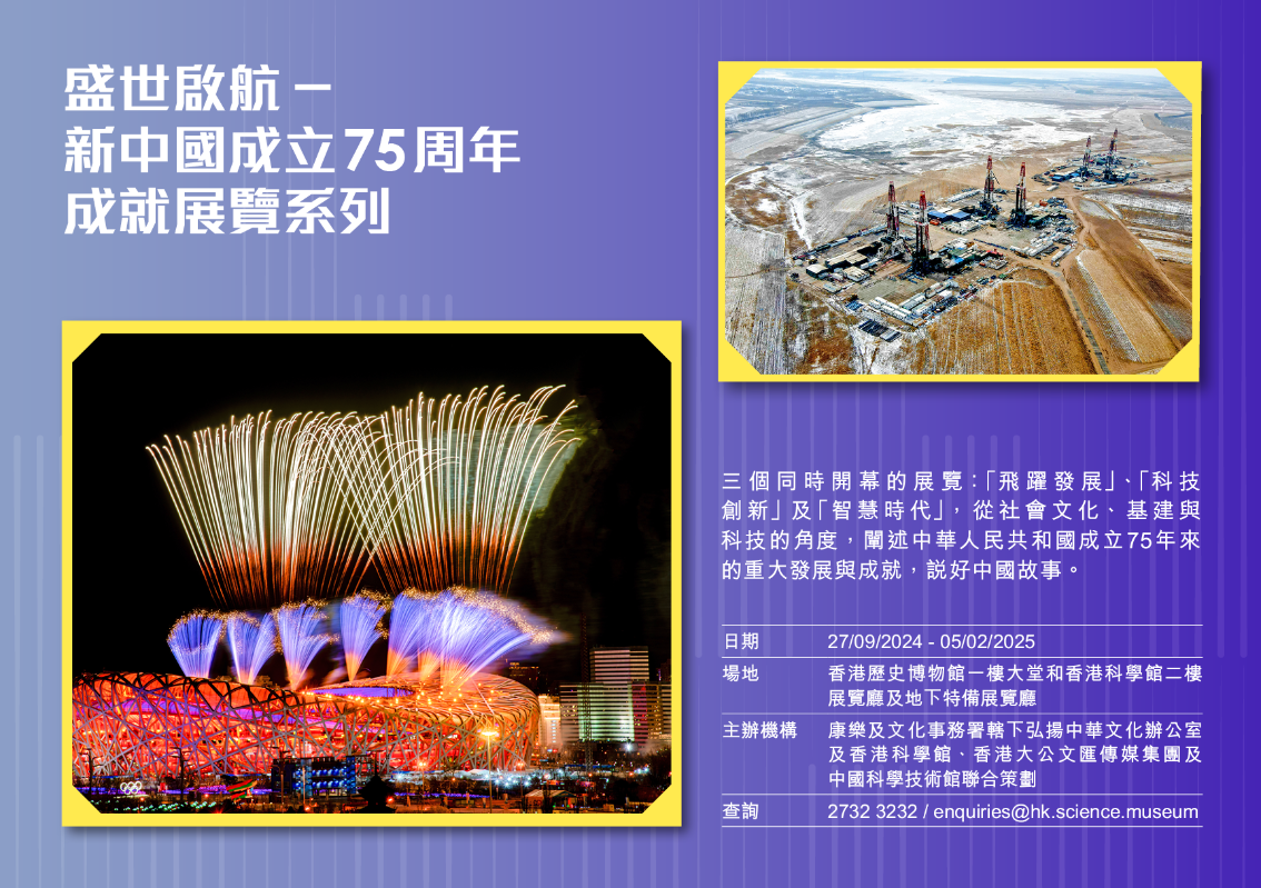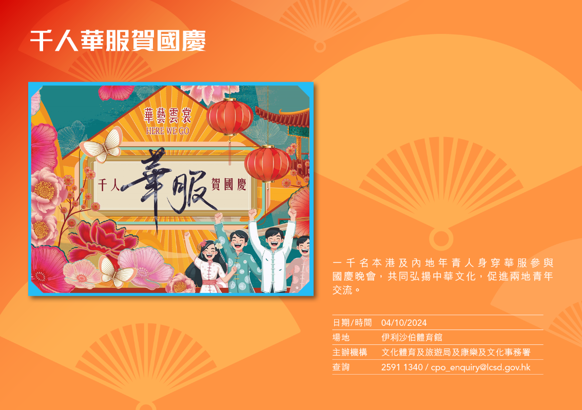 圖源:熱烈慶祝中華人民共和國成立75周年專題網站 10月4日,1000名香港及內地年輕人會參與以展現中華文化魅力和傳承的“千人華服賀國慶”;展示中華人民共和國成立75年來在經濟、基建、社會、文化、體育、科技等領域的飛躍發展和成就的“盛世啟航—新中國成立75周年成就”展覽系列則於9月27日開啟。