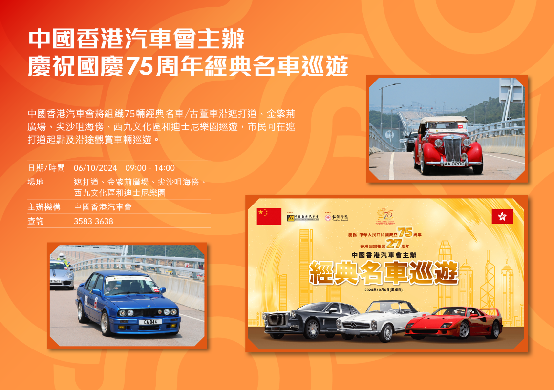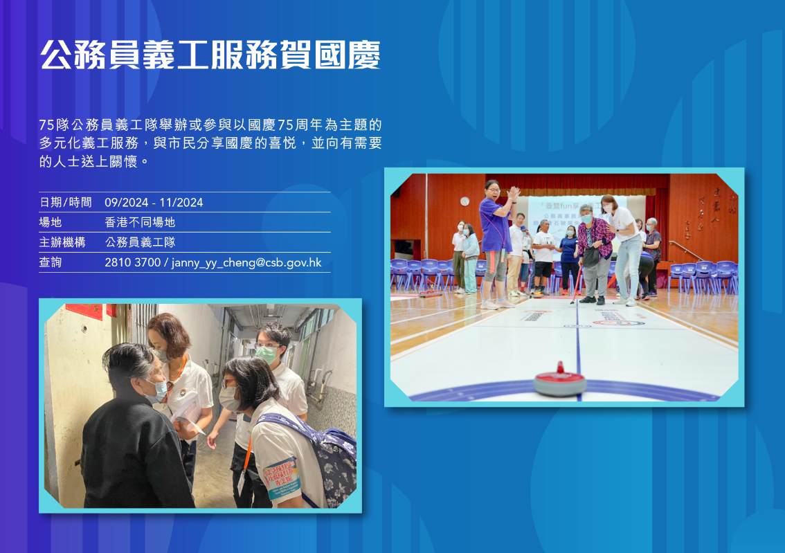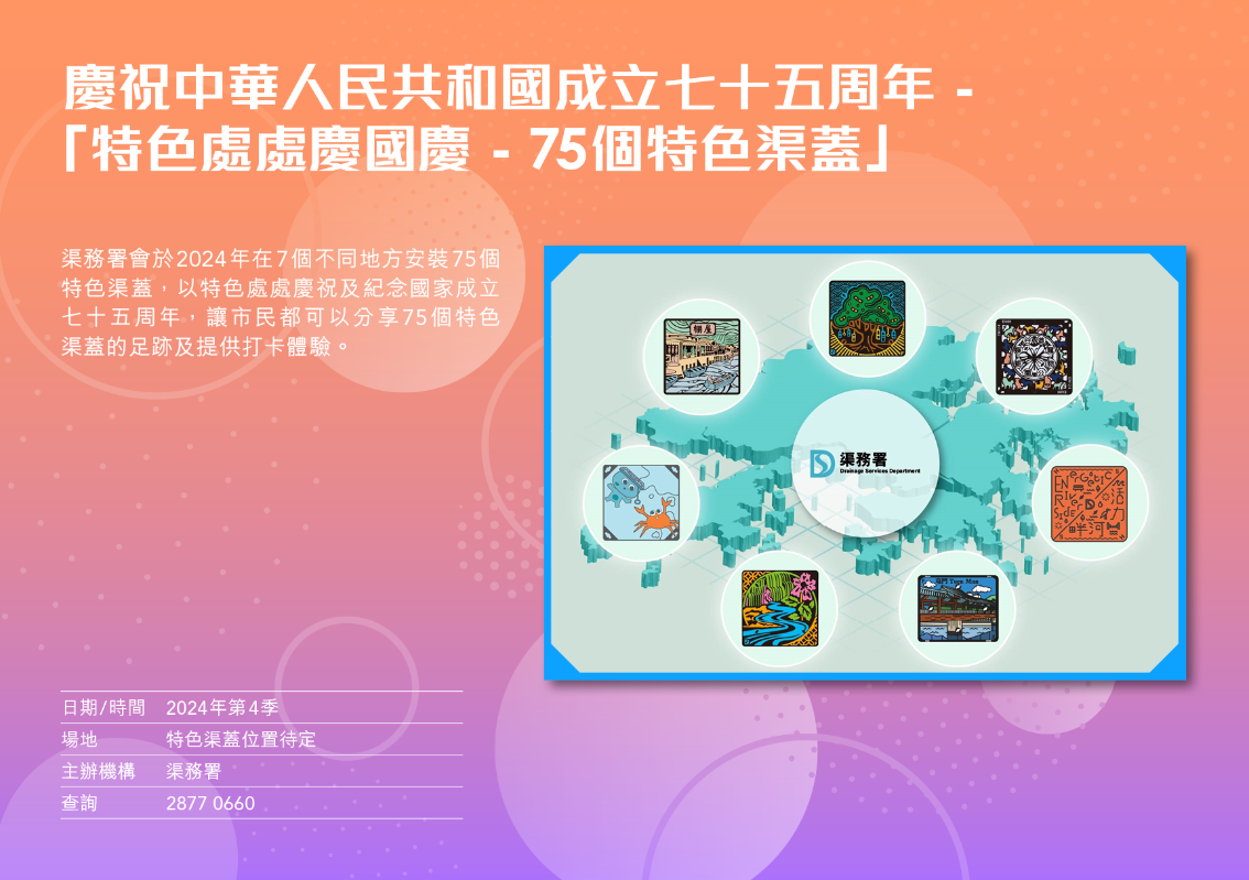 圖源:熱烈慶祝中華人民共和國成立75周年專題網站 鑒於今年是國慶75周年,香港特別在多項亮點活動中加入與“75”數字相關的元素,令活動更具意義,例如75隊公務員義工隊會為弱勢社群提供服務、在75個地點安裝75個特色渠蓋、為750名長者提供一次免費口腔檢查和為750名長者提供免費中醫診症諮詢,以及組織75輛經典名車和古董車在各區巡遊等。