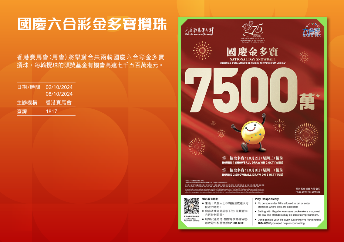 圖源:熱烈慶祝中華人民共和國成立75周年專題網站 香港賽馬會也將於10月初特別舉辦2次國慶六合彩金多寶攪珠,每次估計頭獎基金金額有機會高達7500萬港元,藉此增添國慶的熱鬧氣氛。