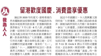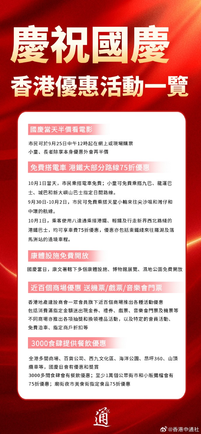 (香港中通社圖片) 特別優惠 與往年一樣,特區政府會聯同社會各界推出各式各樣的優惠,與眾同樂。今年的特別優惠涵蓋公共交通、文化藝術、消閒娛樂、餐飲消費、獎賞活動等多方面,帶動本地消費的同時,亦讓市民感受國慶的喜悅。 公共交通方面,市民10月1日可免費乘搭全線載客電車和多條渡輪航線,用八達通乘搭港鐵、輕鐵及港鐵巴士可享車費七五折優惠。小童用八達通可免費乘搭九巴、龍運巴士及新大嶼山巴士的指定日間巴士路線,亦可以電子支付方式免費乘搭城巴的指定日間巴士路線。