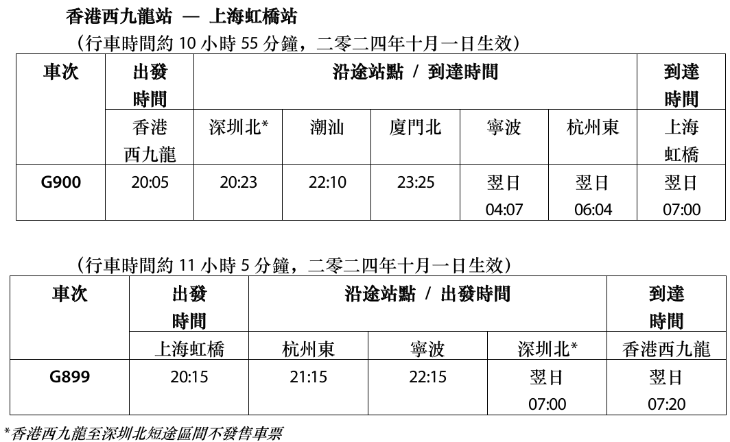來往香港西九龍站與上海虹橋站的復興號臥鋪列車服務時間表 (班次逢周五至周一加班服務)