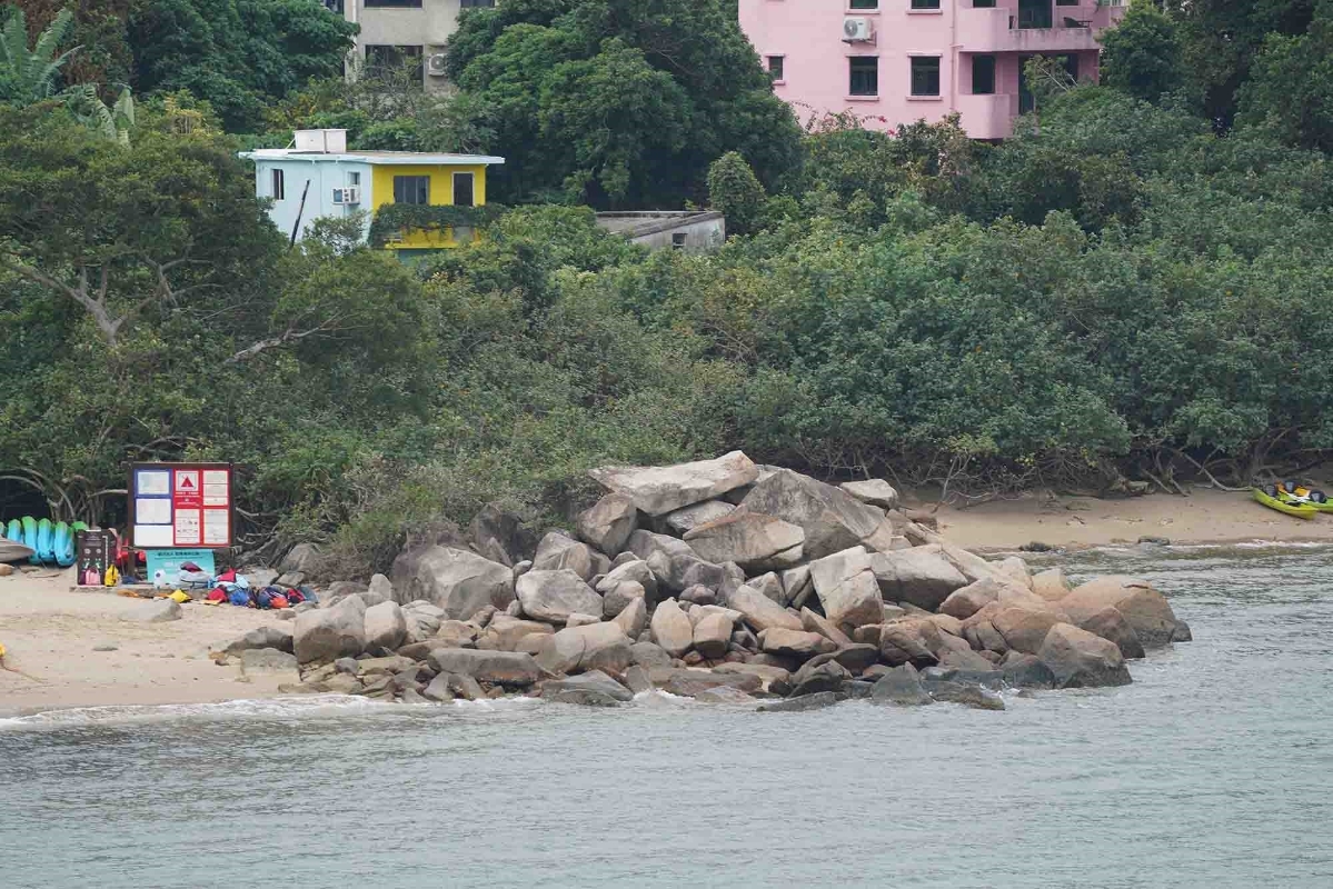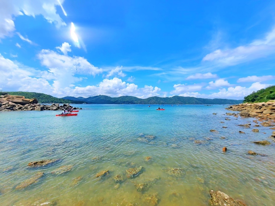 海下灣沙灘旁的石堆大有來頭。相傳,拍打東風石灘上的尖石發出聲音,便會令海上颳東風,因而得名“東風石”。(香港中通社記者 黃璇攝) 海下灣是香港最早開辟的海岸公園之一,以其多樣的珊瑚和魚類而著名。根據香港特區政府環境局的資料,海下灣擁有64種石珊瑚和超過120種珊瑚魚類,這裡的生態系統無疑是非常重要的。在這裡,你可以觀察到海洋無脊椎動物,如海星和水母,進一步展示了這片水域的生態多樣性。 若想盡情欣賞海下灣的美景,遊客需要借助獨木舟。灣中有多個小島,如銀洲、磨洲和烏龜石,彼此相鄰,仿佛一顆顆綠寶石嵌在蔚藍的海上。將獨木舟泊到島邊,走入膝蓋或更深的海水中,戴上潛水鏡,你將能洞察海底的一切。如果想拍攝,記得帶防水相機。