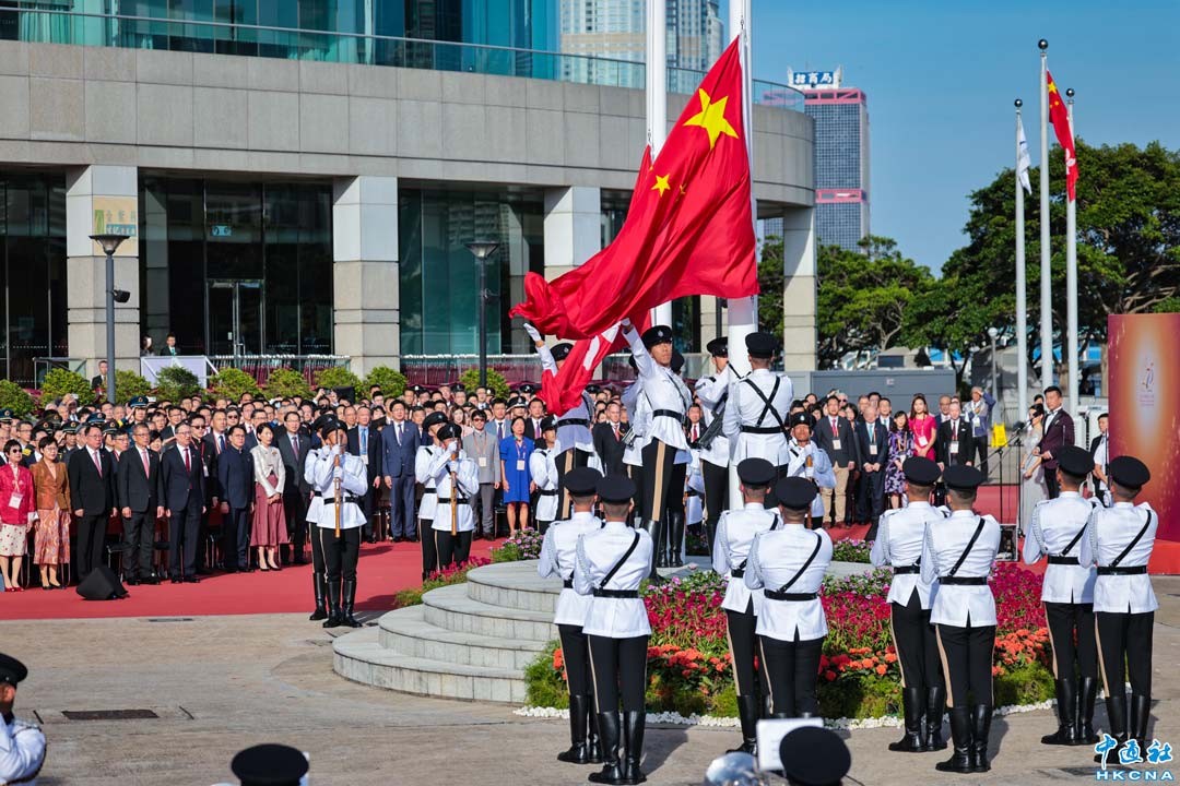 10月1日早上,香港特區政府於金紫荊廣場舉行隆重的升旗儀式,熱烈慶祝中華人民共和國成立75周年。(香港中通社記者 謝光磊攝)