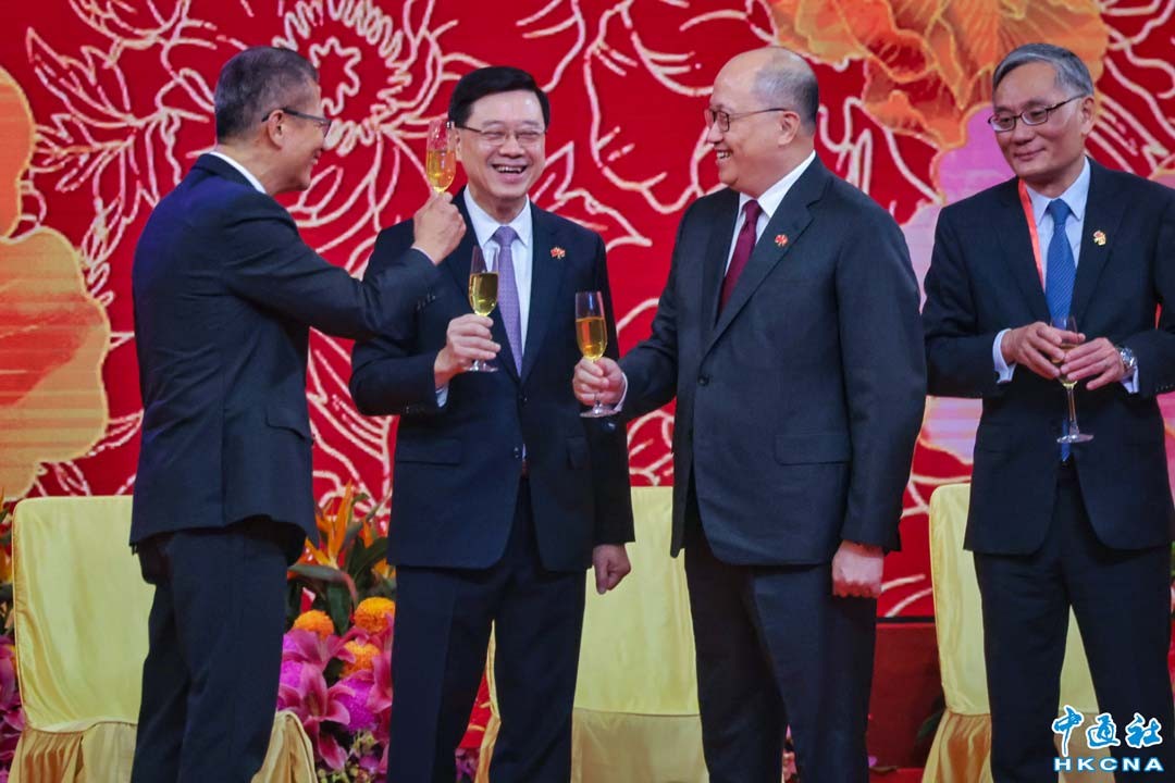 10月1日上午,香港特區政府在會議展覽中心舉行國慶酒會,慶祝中華人民共和國成立75周年。圖為祝酒儀式。(香港中通社記者 謝光磊攝)