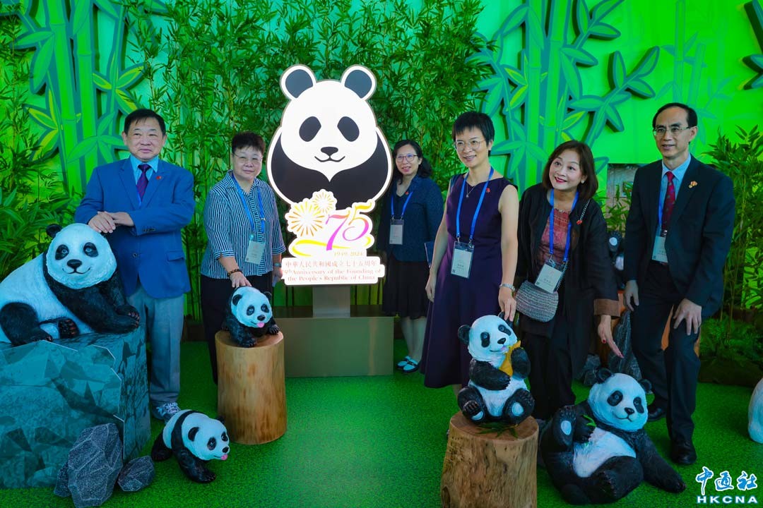 10月1日上午,香港特區政府在會議展覽中心舉行國慶酒會,慶祝中華人民共和國成立75周年。日前,中央政府贈港大熊貓“安安”和“可可”抵達香港,本次國慶酒會會場內也布滿了各式熊貓元素裝飾,吸引許多嘉賓拍照打卡。(香港中通社記者 謝光磊攝)