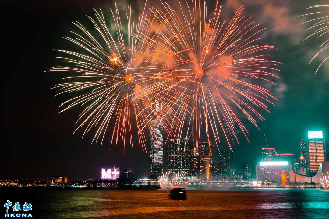 10月1日晚,為慶祝中華人民共和國成立75周年,香港維多利亞港上空舉行國慶煙花匯演。(香港中通社記者 許其皓攝)