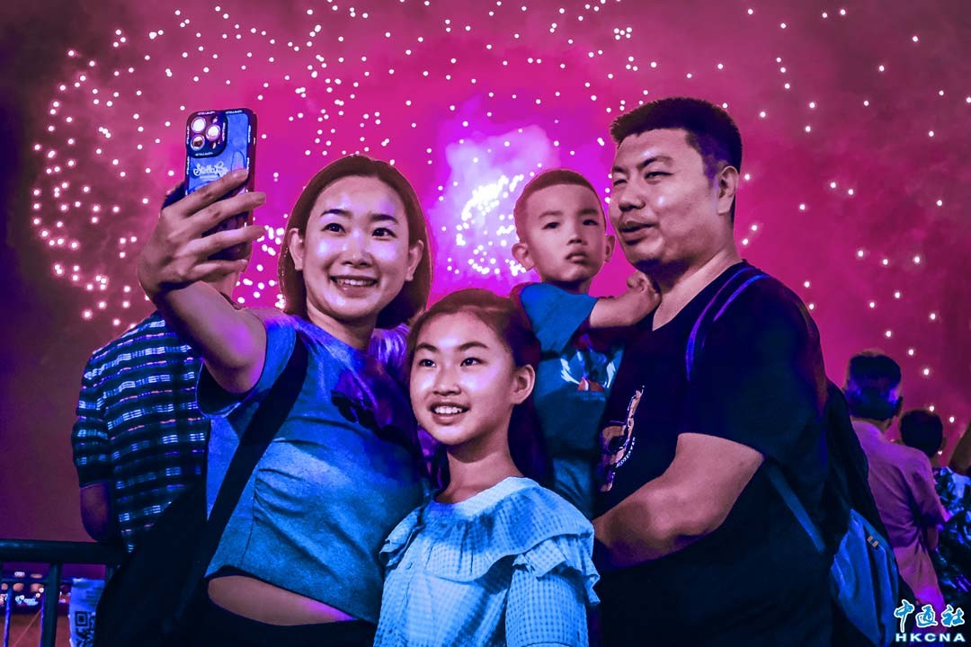10月1日晚,為慶祝中華人民共和國成立75周年,香港維多利亞港上空舉行國慶煙花匯演。圖為市民於灣仔海濱觀賞煙花。(香港中通社記者 許其皓攝)