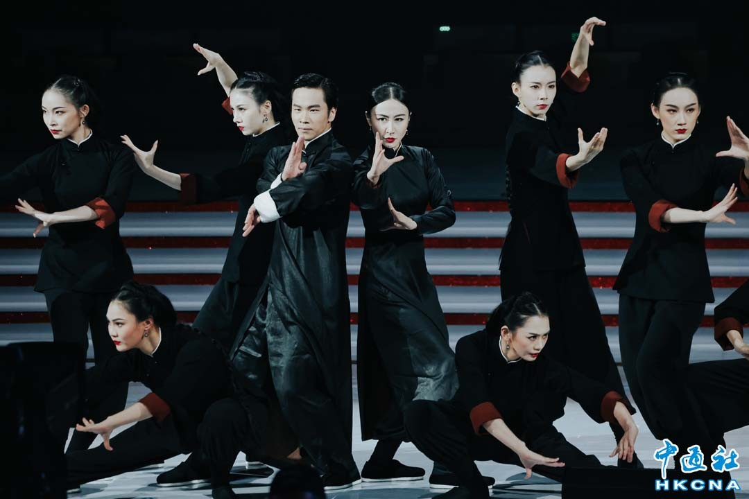 10月2日晚上,“香港同胞慶祝中華人民共和國成立七十五周年文藝晚會”在紅磡香港體育館舉行,主題是“愛國愛港、耀我中華”。圖為來自深圳的舞劇《詠春》主創人員帶來氣勢十足的武術舞蹈表演,現場觀眾得以欣賞一票難求的世界級別劇團演出。(香港中通社記者 謝光磊攝)