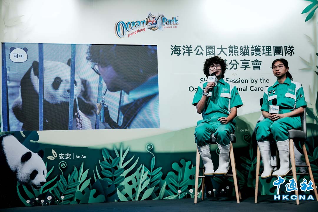 10月3日,中央政府贈送香港的兩隻大熊貓“安安”和“可可”,抵港及進駐海洋公園滿一星期。海洋公園表示,兩隻大熊貓狀態穩定良好,正接受檢疫及適應新生活。圖為現時負責照顧“安安”、“可可”的海洋公園動物部助理館長梁家綸(左)和鄧巧賢(右),分享與牠們相處的感受。(香港中通社記者 謝光磊攝)