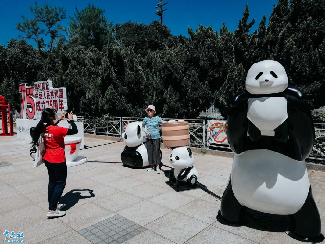近日,香港維園的大熊貓成為市民和遊客打卡點。日前,中央贈予香港的大熊貓“安安”和“可可”入住位於南區的海洋公園,而該園的大熊貓“盈盈”和“樂樂”早前亦誕下龍鳳胎,香港掀起“熊貓熱”。香港各區商戶積極推出一系列大熊貓主題活動、包括餐飲及產品,冀能更好提升香港各區的吸引力,提振地區經濟,同時共賀中華人民共和國成立75周年。(香港中通社記者 洪少葵攝)