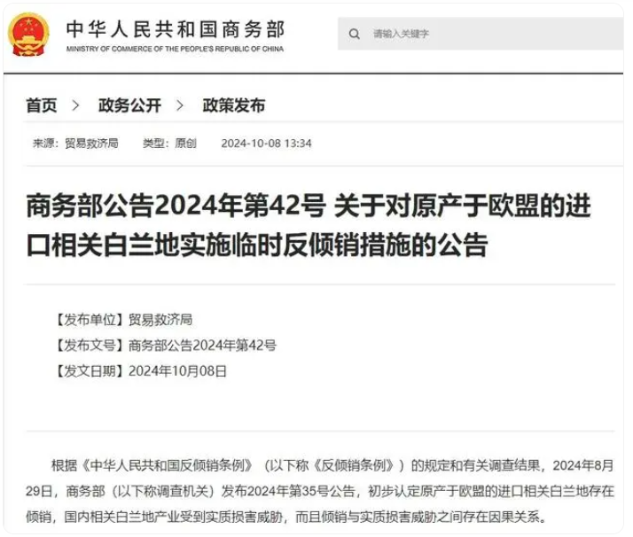 香港新聞網10月8日電 剛剛,商務部發佈《關於對原產於歐盟的進口相關白蘭地實施臨時反傾銷措施的公告》。
