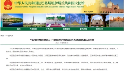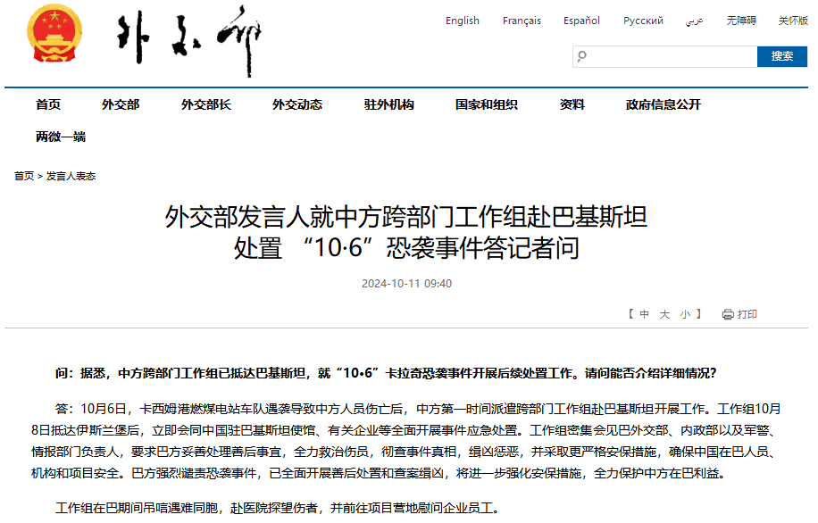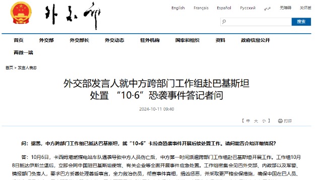 中國外交部網站截圖 6日晚,中資企業卡西姆港發電有限公司車隊在巴基斯坦信德省首府卡拉奇遭遇恐怖襲擊,導致2名中國公民和一名巴基斯坦人遇難,數名中、巴公民受傷。 中國外交部發言人11日介紹,6日,卡西姆港燃煤電站車隊遇襲導致中方人員傷亡後,中方第一時間派遣跨部門工作組赴巴基斯坦開展工作。工作組8日抵達伊斯蘭堡後,立即會同中國駐巴基斯坦使館、有關企業等全面開展事件應急處置。工作組密集會見巴外交部、內政部以及軍警、情報部門負責人,要求巴方妥善處理善後事宜,全力救治傷員,徹查事件真相,緝兇懲惡,並採取更嚴格安保措施,確保中國在巴人員、機構和項目安全。巴方強烈譴責恐襲事件,已全面開展善後處置和查案緝兇,將進一步強化安保措施,全力保護中方在巴利益。 據介紹,中方工作組在巴期間弔唁遇難同胞,赴醫院探望傷者,並前往項目營地慰問企業員工。 據中國駐卡拉奇總領館11日消息,10日晚,“10·6”恐襲案遇難的2位中國公民遺體送別儀式在巴基斯坦卡拉奇國際機場舉行。中國駐卡拉奇總領事楊雲東、中方赴巴跨部門工作組全體成員和信德省省督特索里、首席部長穆拉德、多位省政府內閣部長及巴聯邦內政部常秘阿伽參加。 儀式現場莊嚴肅穆,全體人員肅立默哀,面向遇難者遺體鞠躬並敬獻花圈。儀式結束後,中方工作組護送遇難同胞遺體回國。(完) 【編輯:紀東】