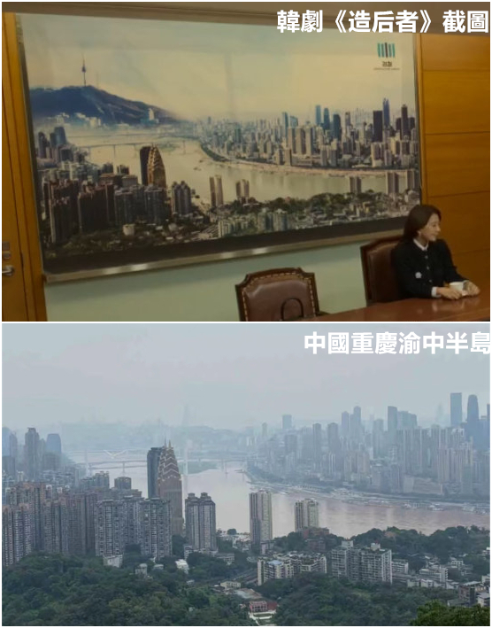 韓劇《造后者》劇中截圖 然而,有眼尖的中國網友發現,該宣傳海報的背景圖片實際上是中國重慶。該圖片是從重慶南山老君洞方向拍攝的渝中半島。而該宣傳海報是在渝中半島圖片的基礎上后期加了一座山。因此,網友質疑《造后者》劇方企圖將其偽裝成韓國首爾的景象。