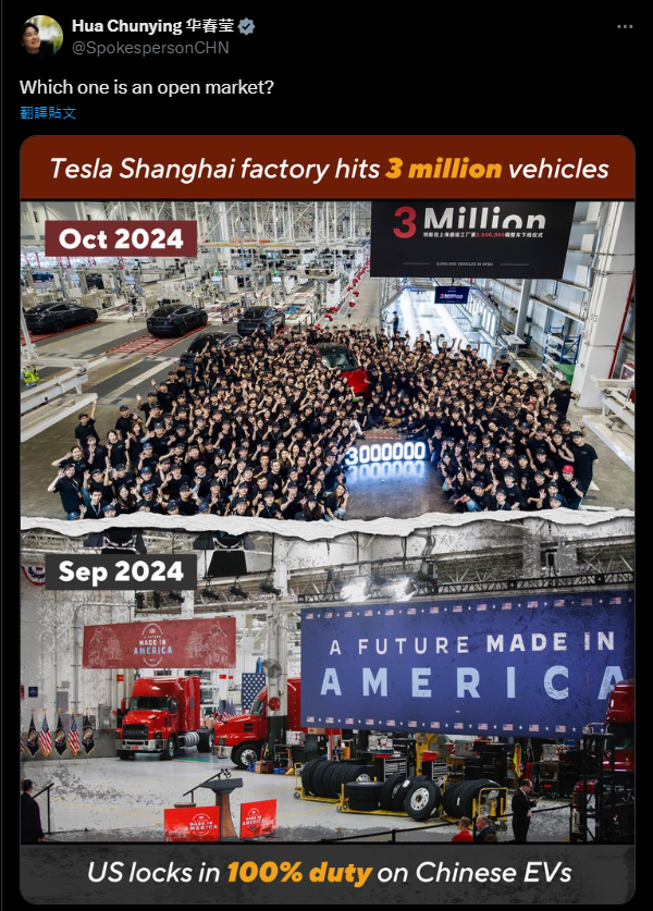 香港新聞網10月13日電 中國外交部副部長、發言人華春瑩12日在社交媒體平台X上發布一組有關中美電動汽車貿易的對比圖,批評美國對華貿易保護主義行徑。 對比圖的上半部分顯示,2024年10月,特斯拉上海超級工廠第300萬輛整車正式下線;圖片下半部分顯示,2024年9月,美國宣布對中國電動汽車徵收100%的關稅。