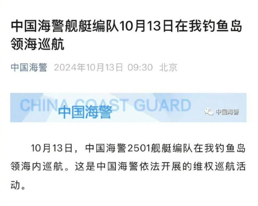 香港中通社10月13日電 據中國海警局13日消息,當日,中國海警2501艦艇編隊在中國釣魚島領海內巡航。這是中國海警依法開展的維權巡航活動。