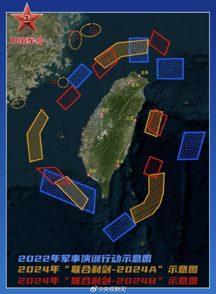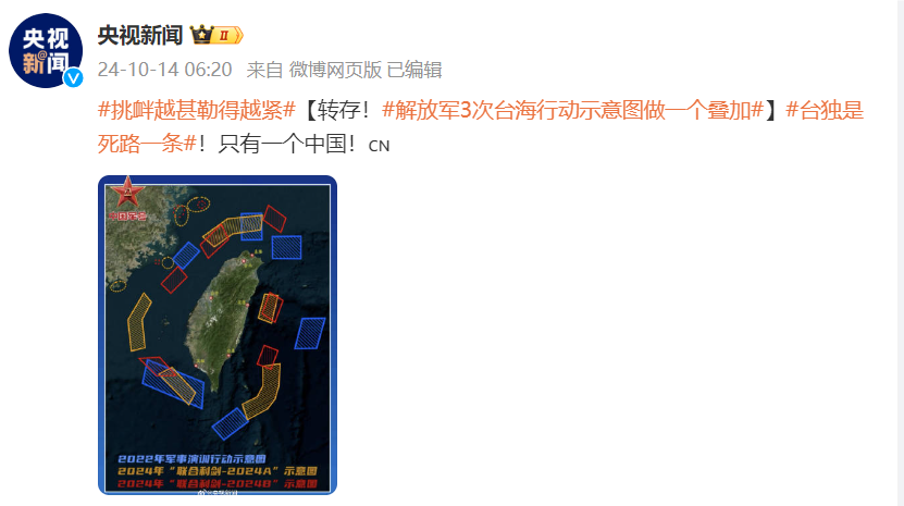解放軍3次台海行動示意圖做一個叠加。央視新聞圖 全文如下: 解放軍報:冥頑不化難逃覆滅,謀“獨”挑釁注定失敗 10月10日,賴清德在台北發表所謂“雙十”講話。這份講話充斥“獨味”與“毒味”,蓄意割裂兩岸歷史聯結,繼續鼓吹“互不隸屬”的“新兩國論”,編造“台獨”謬論,宣揚分裂主張,煽動兩岸敵意對抗,嚴重破壞台海和平穩定,遭到各方強烈批評。 10月14日,中國人民解放軍東部戰區組織戰區陸軍、海軍、空軍、火箭軍等兵力,位台灣海峽、台島北部、台島南部、台島以東,開展“聯合利劍-2024B”演習。這是對“台獨”分裂勢力謀“獨”行徑的強力震懾,是捍衛國家主權、維護國家統一的正當必要行動。 統一是歷史大勢,是正道。1840年鴉片戰爭之後,為戰勝外來侵略、爭取民族解放、實現國家統一,中華兒女前赴後繼,進行了可歌可泣的鬥爭。孫中山先生率先發出“振興中華”的呐喊,領導辛亥革命取得成功,為實現中華民族偉大復興探索道路。台灣自古就是中國的神聖領土,近代曾被外國侵略勢力侵佔,台灣民眾深受其苦。1945年,中國人民取得抗日戰爭的偉大勝利,台灣隨之光複。1949年以後,由於中國內戰延續和外部勢力干涉,海峽兩岸陷入長期政治對立的特殊狀態,但台灣始終是中國領土的一部分,台灣同胞始終是中華民族的一分子,中華人民共和國政府始終是代表包括台灣在內的全中國的唯一合法政府,中國始終是全體中華兒女的偉大祖國,堅持一個中國原則始終是國際社會的普遍共識。 賴清德對台灣問題明明白白的歷史經緯置若罔聞,對海峽兩岸同宗同源的事實現狀視而不見。在所謂“雙十”講話中,他處心積慮為分裂國家拼凑依據,強行灌輸其“台獨”主張,重彈“民主對抗威權”的老調,以所謂“民主自由”為幌子,繼續“倚外謀獨”“以武謀獨”,企圖將台灣綁上“台獨”戰車。賴清德新瓶裝舊酒的“台獨”謬論,再次暴露其冥頑不化的“台獨”立場和昇高敵意對抗的險惡用心,將給台灣民眾帶來深重災難。 “台獨”是歷史逆流,是絕路。過去8年,兩岸關係急轉直下的事實充分證明,民進黨的“台獨”路線、對抗路線、害台路線是台灣陷入兵凶戰危、社會極度撕裂對立、經濟民生嚴重受損的禍根亂源。賴清德一意孤行走“台獨”絕路,讓台灣離和平、繁榮越來越遠,離戰爭、衰退越來越近。 玩火者必自焚!賴清德和民進黨當局在“台獨”錯誤路線上膽敢鋌而走險,必遭沉重打擊,難逃覆滅的歷史鐵律。中國人民解放軍東部戰區開展“聯合利劍-2024B”演習再次證明,“台獨”分裂勢力妄動一分,解放軍的軍事反制就更進一步,勒在“台獨”分裂勢力脖子上的鏈條就更緊一分,懸在“台獨”分裂勢力頭上的利劍就更近一寸。 實現中華民族偉大復興是近代以來中華民族最偉大的夢想,也始終關係著兩岸同胞的前途命運。台灣前途在於國家統一,台灣同胞福祉繫於民族復興。無論賴清德拋出什麼樣的“歷史悖論”“台獨怪談”,都改變不了兩岸同屬一個中國的客觀事實,扼殺不了台灣同胞的祖國意識。我們有信心和能力實現祖國完全統一,任何人、任何勢力都阻擋不了民族復興、國家統一的歷史大勢。我們願以最大的誠意,盡最大的努力爭取和平統一的前景,但決不為任何形式的“台獨”分裂活動留下任何餘地,決不容忍謀“獨”挑釁,堅決粉碎分裂圖謀,堅決斬斷分裂幻想。 中國人民解放軍始終強化練兵備戰,全面提升打贏能力,堅決反制反擊“台獨”分裂活動和外部干涉。只要“台獨”挑釁一日不止,解放軍捍衛國家主權和領土完整的行動就一刻不停。(完)
