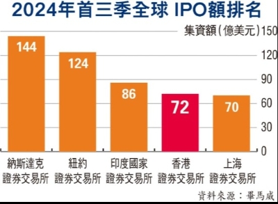香港中通社圖片 畢馬威近日發表“中國內地和香港IPO市場:2024年第三季度回顧”報告稱,截至2024年第三季,全球IPO市場共有851件交易,集資額833億美元,按年比較,上市件數年減15%,集資額年減21%。美國的兩家證交所在集資額方面繼續領先全球,占全球IPO集資總額的三分之一;印度證交所排名第三,而港交所及上海證券交易所則分別排名第四和第五。 報告指出,香港IPO活動在今年第三季出現復甦跡象,年初至今共有45件上市、共集資556億港幣,集資額和件數年增分別為123%和2%。消費行業在集資額方面佔有領先位置,達357億港幣,佔年初迄今集資額的64%。另外,美的集團9月17日登陸港交所,IPO集資額達306.68億港幣。 報導稱,9月下旬在內地最新的經濟刺激措施推動下,A股和港股表現火爆,其中港股9月份大漲17.48%,10月延續多頭氣勢,截至10月10日今年累計漲幅達26.6%。在市場情緒推動下,預計將吸引更多資金流入。 港股冷灶轉為熱灶,也讓先前許多觀望的企業搶著重啟IPO。香港新股IPO市場得以回暖之際,多家企業加快部署上市,其中較知名的包括汽車晶片商地平線、京東集團旗下京東工業等,均向香港聯交所遞交IPO申請。據統計,9月20日起至10月2日,已有12家公司遞表申請赴港上市。 另據港媒14日援引香港交易所行政總裁陳翊庭的消息稱,因應市場對資金快速出入的需求,香港交易所明年上半年將就應否推行證券交易T+1結算發表白皮書以展開討論。目前,香港交易所當前股票和貨幣交易,是在交易日後兩個營業日結算,即T+2。(完) 【編輯:紀東】